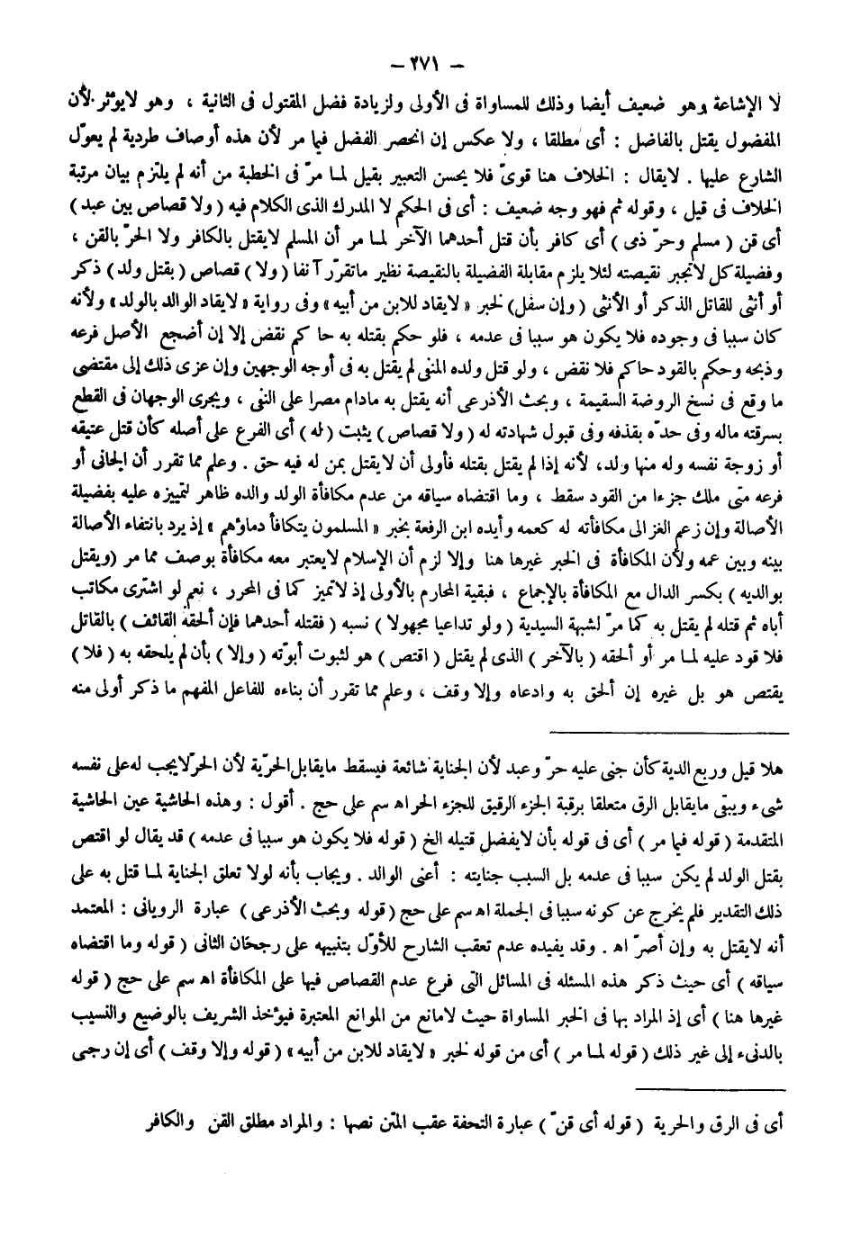 لَا يُقَالُ: الْخِلَافُ هُنَا قَوِيٌّ فَلَا يَحْسُنُ التَّعْبِيرُ بِقِيلِ لِمَا مَرَّ فِي الْخِطْبَةِ مِنْ أَنَّهُ لَمْ يَلْتَزِمْ بَيَانَ مَرْتَبَةِ الْخِلَافِ فِي قِيلَ، وَقَوْلُهُ: ثَمَّ فَهُوَ وَجْهٌ ضَعِيفٌ: أَيْ فِي الْحُكْمِ لَا الْمُدْرَكِ الَّذِي الْكَلَامُ فِيهِ (وَلَا قِصَاصَ بَيْنَ عَبْدٍ) أَيْ قِنٍّ (مُسْلِمٍ وَحُرٍّ ذِمِّيٍّ) أَيْ كَافِرٍ بِأَنْ قَتَلَ أَحَدُهُمَا الْآخَرَ لِمَا مَرَّ أَنَّ الْمُسْلِمَ لَا يُقْتَلُ بِالْكَافِرِ وَلَا الْحُرُّ بِالْقِنِّ، وَفَضِيلَةُ كُلٍّ لَا تَجْبُرُ نَقِيصَتَهُ لِئَلَّا يَلْزَمَ مُقَابَلَةُ الْفَضِيلَةِ بِالنَّقِيصَةِ نَظِيرَ مَا تَقَرَّرَ آنِفًا
