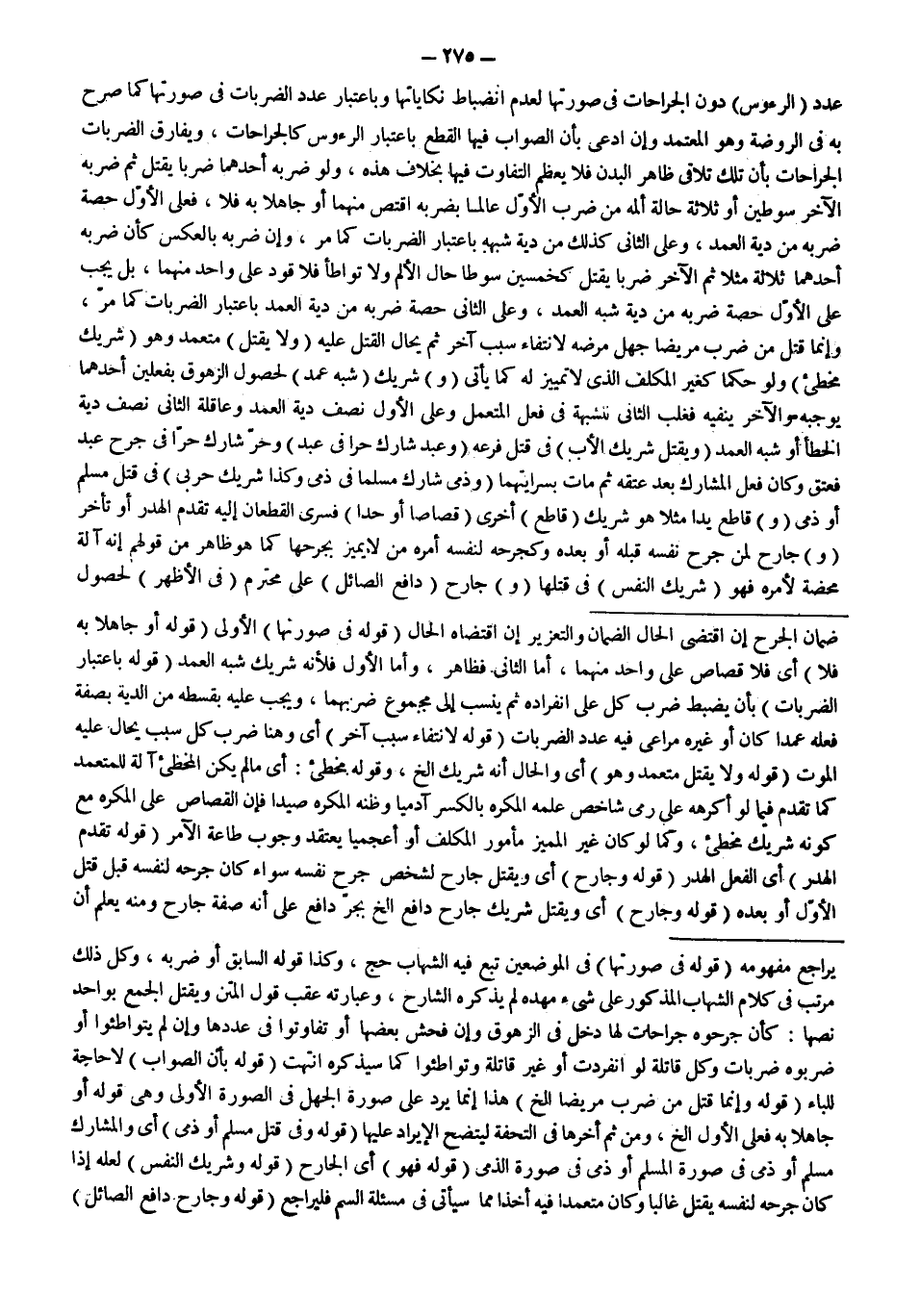 عَدَدِ (الرُّءُوسِ) دُونَ الْجِرَاحَاتِ فِي صُورَتِهَا لِعَدَمِ انْضِبَاطِ نِكَايَاتِهَا وَبِاعْتِبَارِ عَدَدِ الضَّرَبَاتِ فِي صُورَتِهَا كَمَا صَرَّحَ بِهِ فِي الرَّوْضَةِ وَهُوَ الْمُعْتَمَدُ وَإِنْ ادَّعَى بِأَنَّ الصَّوَابَ فِيهَا الْقَطْعُ بِاعْتِبَارِ الرُّءُوسِ كَالْجِرَاحَاتِ، وَيُفَارِقُ الضَّرَبَاتُ الْجِرَاحَاتِ بِأَنَّ تِلْكَ تُلَاقِي ظَاهِرَ الْبَدَنِ فَلَا يَعْظُمُ التَّفَاوُتُ فِيهَا بِخِلَافِ هَذِهِ، وَلَوْ ضَرَبَهُ أَحَدُهُمَا ضَرْبًا يَقْتُلُ ثُمَّ ضَرَبَهُ الْآخَرُ سَوْطَيْنِ أَوْ ثَلَاثَةً حَالَةَ أَلَمِهِ مِنْ ضَرْبِ الْأَوَّلِ عَالِمًا بِضَرْبِهِ اُقْتُصَّ مِنْهُمَا أَوْ جَاهِلًا بِهِ فَلَا، فَعَلَى الْأَوَّلِ حِصَّةُ ضَرْبِهِ مِنْ دِيَةِ الْعَمْدِ، وَعَلَى الثَّانِي كَذَلِكَ مِنْ دِيَةِ شُبْهَةِ بِاعْتِبَارِ الضَّرَبَاتِ كَمَا مَرَّ، وَإِنْ ضَرَبَهُ بِالْعَكْسِ كَأَنْ ضَرَبَهُ أَحَدُهُمَا ثَلَاثَةً مَثَلًا ثُمَّ الْآخَرُ ضَرْبًا يَقْتُلُ كَخَمْسِينَ سَوْطًا حَالَ الْأَلَمِ وَلَا تَوَاطُؤَ فَلَا قَوَدَ عَلَى وَاحِدٍ مِنْهُمَا، بَلْ يَجِبُ عَلَى الْأَوَّلِ حِصَّةُ ضَرْبِهِ مِنْ دِيَةِ شِبْهِ الْعَمْدِ، وَعَلَى الثَّانِي حِصَّةُ ضَرْبِهِ مِنْ دِيَةِ الْعَمْدِ بِاعْتِبَارِ الضَّرَبَاتِ كَمَا مَرَّ، وَإِنَّمَا قُتِلَ مَنْ ضَرَبَ مَرِيضًا جَهِلَ مَرَضَهُ لِانْتِفَاءِ سَبَبٍ آخَرَ ثَمَّ يُحَالُ الْقَتْلُ عَلَيْهِ