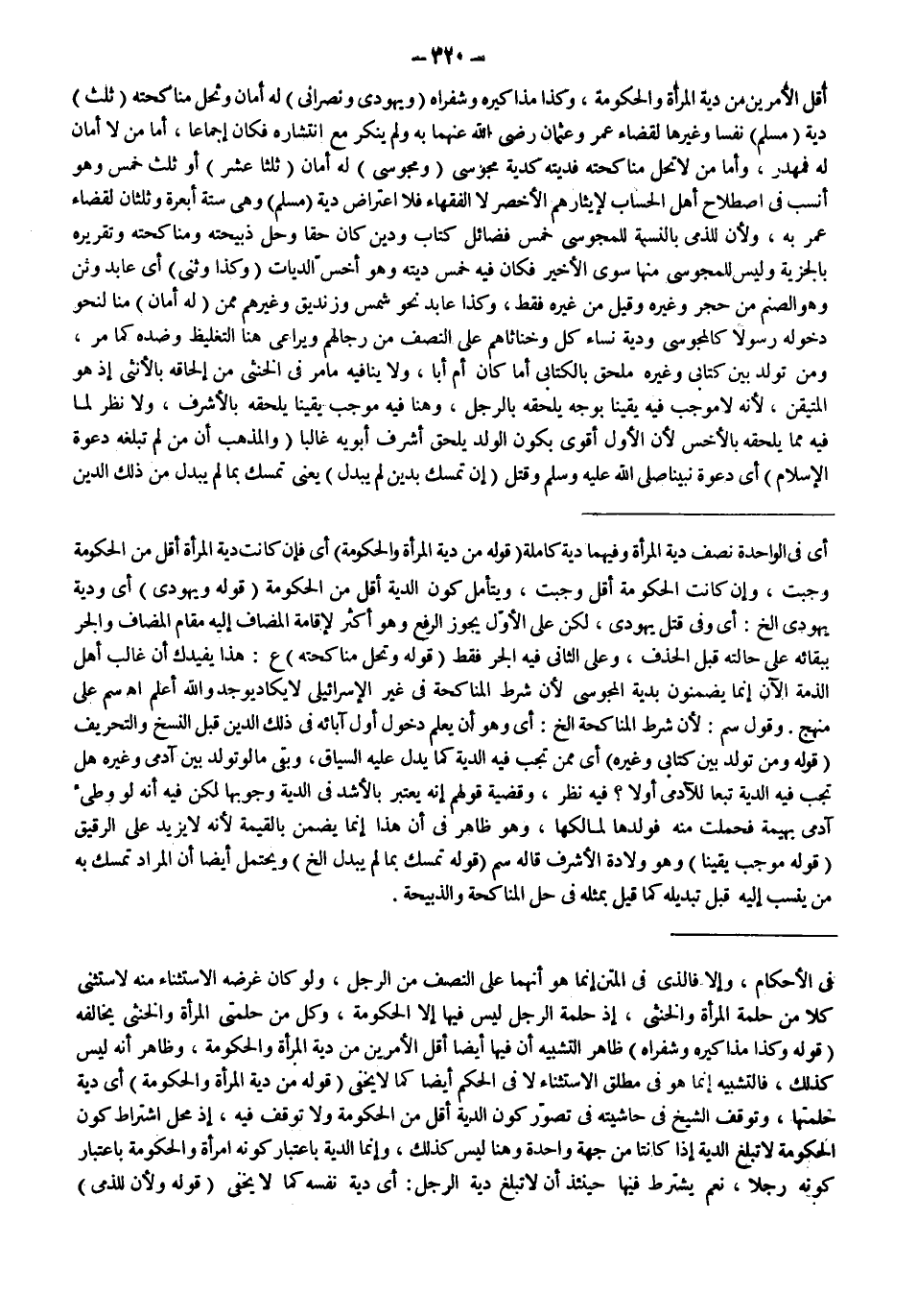 ـــــــــــــــــــــــــــــQفِي الْأَحْكَامِ، وَإِلَّا فَاَلَّذِي فِي الْمَتْنِ إنَّمَا هُوَ أَنَّهُمَا عَلَى النِّصْفِ مِنْ الرَّجُلِ، وَلَوْ كَانَ غَرَضُهُ الِاسْتِثْنَاءَ مِنْهُ لَاسْتَثْنَى كُلًّا مِنْ حَلَمَةِ الْمَرْأَةِ وَالْخُنْثَى، إذْ حَلَمَةُ الرَّجُلِ لَيْسَ فِيهَا إلَّا الْحُكُومَةُ، وَكُلٌّ مِنْ حَلَمَتَيْ الْمَرْأَةِ وَالْخُنْثَى يُخَالِفُهُ (قَوْلُهُ: وَكَذَا مَذَاكِيرُهُ وَشَفْرَاهُ) ظَاهِرُ التَّشْبِيهِ أَنَّ فِيهَا أَيْضًا أَقَلَّ الْأَمْرَيْنِ مِنْ دِيَةِ الْمَرْأَةِ وَالْحُكُومَةِ، وَظَاهِرٌ أَنَّهُ لَيْسَ كَذَلِكَ، فَالتَّشْبِيهُ إنَّمَا هُوَ فِي مُطْلَقِ الِاسْتِثْنَاءِ لَا فِي الْحُكْمِ أَيْضًا كَمَا لَا يَخْفَى (قَوْلُهُ: مِنْ دِيَةِ الْمَرْأَةِ وَالْحُكُومَةِ) أَيْ دِيَةِ حَلَمَتِهَا، وَتَوَقَّفَ الشَّيْخُ فِي حَاشِيَتِهِ فِي تَصَوُّرِ كَوْنِ الدِّيَةِ أَقَلَّ مِنْ الْحُكُومَةِ وَلَا تَوَقُّفَ فِيهِ، إذْ مَحَلُّ اشْتِرَاطِ كَوْنِ الْحُكُومَةِ لَا تَبْلُغُ الدِّيَةَ إذَا كَانَتَا مِنْ جِهَةٍ وَاحِدَةٍ وَهُنَا لَيْسَ كَذَلِكَ، وَإِنَّمَا الدِّيَةُ بِاعْتِبَارِ كَوْنِهِ امْرَأَةً وَالْحُكُومَةُ بِاعْتِبَارِ كَوْنِهِ رَجُلًا، نَعَمْ يُشْتَرَطُ فِيهَا حِينَئِذٍ أَنْ لَا تَبْلُغَ دِيَةَ الرَّجُلِ: أَيْ دِيَةَ نَفْسِهِ كَمَا لَا يَخْفَى