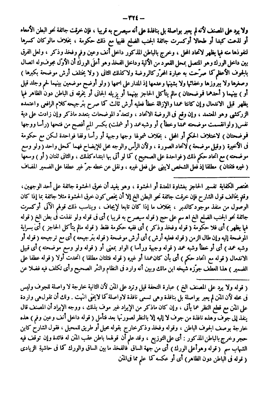 ـــــــــــــــــــــــــــــSمُخْتَصَرِ الْكِفَايَةِ تَفْسِيرُ الْحَاجِزِ بِغِشَاوَةٍ الْمَعِدَةُ أَوْ الْحُشْوَةُ، وَهُوَ يُفِيدُ أَنَّ خَرْقَ الْحَشْوَةِ جَائِفَةٌ عَلَى أَحَدِ الْوَجْهَيْنِ، وَقَدْ يُخَالِفُ قَوْلَ الشَّارِحِ فَإِنْ خَرَقَتْ جَائِفَةٌ نَحْوَ الْبَطْنِ إلَخْ إلَّا أَنْ يُخَصَّ كَوْنُ خَرْقِ الْحَشْوَةِ مَثَلًا جَائِفَةً بِمَا إذَا كَانَ الْوُصُولُ مِنْ مَنْفَذٍ مَوْجُودٍ كَالدُّبُرِ، بِخِلَافِ مَا إذَا كَانَ تَابِعًا لِإِيجَافٍ، وَيُنَاسِبُ ذَلِكَ قَوْلُهُمْ الْآتِي: أَوْ كَسَرَتْ جَائِفَةٌ نَحْوُ الْجَنْبِ الضِّلْعَ إلَخْ اهـ سم عَلَى حَجّ