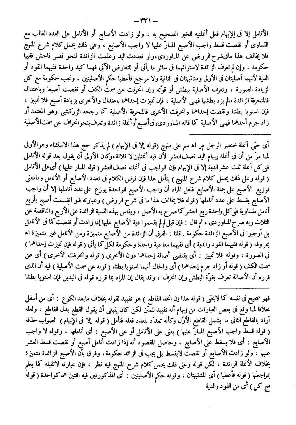الْأَنَامِلِ إلَّا فِي الْإِبْهَامِ فِعْلُ أَنْمُلَتَيْهِ لِلْخَبَرِ الصَّحِيحِ بِهِ، وَلَوْ زَادَتْ الْأَصَابِعُ أَوْ الْأَنَامِلُ عَلَى الْعَدَدِ الْغَالِبِ مَعَ التَّسَاوِي أَوْ نَقَصَتْ قُسِّطَ وَاجِبُ الْأُصْبُعِ الْمَارُّ عَلَيْهَا لَا وَاجِبُ الْأَصَابِعِ، وَعَلَى ذَلِكَ يُحْمَلُ كَلَامُ شَرْحِ الْمَنْهَجِ فَلَا يُخَالِفُ هَذَا مَا فِي شَرْحِ الرَّوْضِ عَنْ الْمَاوَرْدِيِّ، وَلَوْ تَعَدَّدَتْ الْيَدُ وَعُلِمَتْ الزَّائِدَةُ لِنَحْوِ قِصَرٍ فَاحِشٍ فَفِيهَا حُكُومَةٌ، وَإِنْ لَمْ تُعْرَفْ الزَّائِدَةُ لِاسْتِوَائِهِمَا فِي سَائِرِ مَا يَأْتِي أَوْ لِلتَّعَارُضِ الْآتِي فَهُمَا كَيَدٍ وَاحِدَةٍ فَفِيهِمَا الْقَوَدُ أَوْ الدِّيَةُ؛ لِأَنَّهُمَا أَصْلِيَّتَانِ فِي الْأُولَى وَمُشْتَبِهَتَانِ فِي الثَّانِيَةِ وَلَا مُرَجِّحَ فَأُعْطِيَا حُكْمَ الْأَصْلِيَّتَيْنِ، وَتَجِبُ حُكُومَةٌ مَعَ كُلٍّ لِزِيَادَةِ الصُّورَةِ، وَتُعْرَفُ الْأَصْلِيَّةُ بِبَطْشٍ أَوْ قُوَّتِهِ وَإِنْ انْحَرَفَتْ عَنْ سَمْتِ الْكَفِّ أَوْ نَقَصَتْ أُصْبُعًا وَبِاعْتِدَالٍ فَالْمُنْحَرِفَةُ الزَّائِدَةُ مَا لَمْ يَزِدْ بَطْشُهَا فَهِيَ الْأَصْلِيَّةُ، فَإِنْ تَمَيَّزَتْ إحْدَاهُمَا بِاعْتِدَالٍ وَالْأُخْرَى بِزِيَادَةِ أُصْبُعٍ فَلَا تَمْيِيزَ، فَإِنْ اسْتَوَيَا بَطْشًا وَنَقَصَتْ إحْدَاهُمَا وَانْحَرَفَتْ الْأُخْرَى فَالْمُنْحَرِفَةُ الْأَصْلِيَّةُ كَمَا رَجَّحَهُ الزَّرْكَشِيُّ وَهُوَ الْمُعْتَمَدُ أَوْ زَادَ جِرْمُ أَحَدِهِمَا فَهِيَ الْأَصْلِيَّةُ كَمَا قَالَهُ الْمَاوَرْدِيُّ وَفِي أُصْبُعٍ أَوْ أُنْمُلَةٍ زَائِدَةٍ وَتُعْرَفُ بِنَحْوِ انْحِرَافٍ عَنْ سَمْتِ الْأَصْلِيَّةِ
