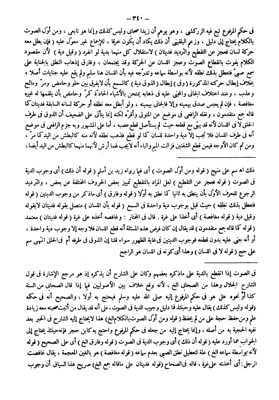 ـــــــــــــــــــــــــــــQفِي الصَّوْتِ إذَا انْقَطَعَ بِالدِّيَةِ عَلَى مَا ذَكَرَهُ بَعْضُهُمْ وَكَانَ عَلَى الشَّارِحِ أَنْ يَذْكُرَهُ إذْ هُوَ مَرْجِعُ الْإِشَارَةِ فِي قَوْلِ الشَّارِحِ الْجَلَالِ وَهَذَا مِنْ الصَّحَابِيِّ إلَخْ. لِأَنَّهُ وَقَعَ خِلَافٌ بَيْنَ الْأُصُولِيِّينَ فِيمَا إذَا قَالَ الصَّحَابِيُّ مِنْ السُّنَّةِ كَذَا أَوْ نَحْوَهُ هَلْ هُوَ فِي حُكْمِ الْمَرْفُوعِ إلَيْهِ - صَلَّى اللَّهُ عَلَيْهِ وَسَلَّمَ -، فَيَحْتَجُّ بِهِ أَوْ لَا، وَالصَّحِيحُ أَنَّهُ فِي حُكْمِهِ (قَوْلُهُ: وَلَيْسَ كَذَلِكَ) يُقَالُ عَلَيْهِ وَحِينَئِذٍ فَمَا دَلِيلُ وُجُوبِ الدِّيَةِ فِي الصَّوْتِ، عَلَى أَنَّهُ قَدْ يُقَالُ مَنْ أَثْبَتَ صُحْبَتَهُ مَعَهُ زِيَادَةُ عِلْمٍ وَمَنْ حَفِظَ حُجَّةٌ عَلَى مَنْ لَمْ يَحْفَظْ (قَوْلُهُ: وَمَنْ أَوَّلَ الصَّوْتَ بِالْكَلَامِ إلَخْ.) هَذَا لَا يَحْتَاجُ إلَيْهِ الشَّارِحُ فِي الْخَبَرِ بَعْدَ نَفْيِهِ الْحُجِّيَّةَ بِهِ مِنْ أَصْلِهِ، وَإِنَّمَا يَحْتَاجُ إلَيْهِ مَنْ جَعَلَهُ فِي حُكْمِ الْمَرْفُوعِ وَاحْتَجَّ بِهِ كَابْنِ حَجَرٍ فَإِنَّهُ حِينَئِذٍ يَحْتَاجُ إلَى الْجَوَابِ عَمَّا أَوْرَدَ عَلَيْهِ (قَوْلُهُ: أَنَّ ذَلِكَ) أَيْ وُجُوبَ الدِّيَةِ فِي الصَّوْتِ (قَوْلُهُ: وَفَارَقَ إلَخْ.) أَيْ عَلَى الصَّحِيحِ (قَوْلُهُ: لِأَنَّهُ بِوَاسِطَةِ سَمَاعِهِ إلَخْ.) عِلَّةٌ لِتَعْطِيلِ نُطْقِ الصَّبِيِّ بِعَدَمِ سَمَاعِهِ