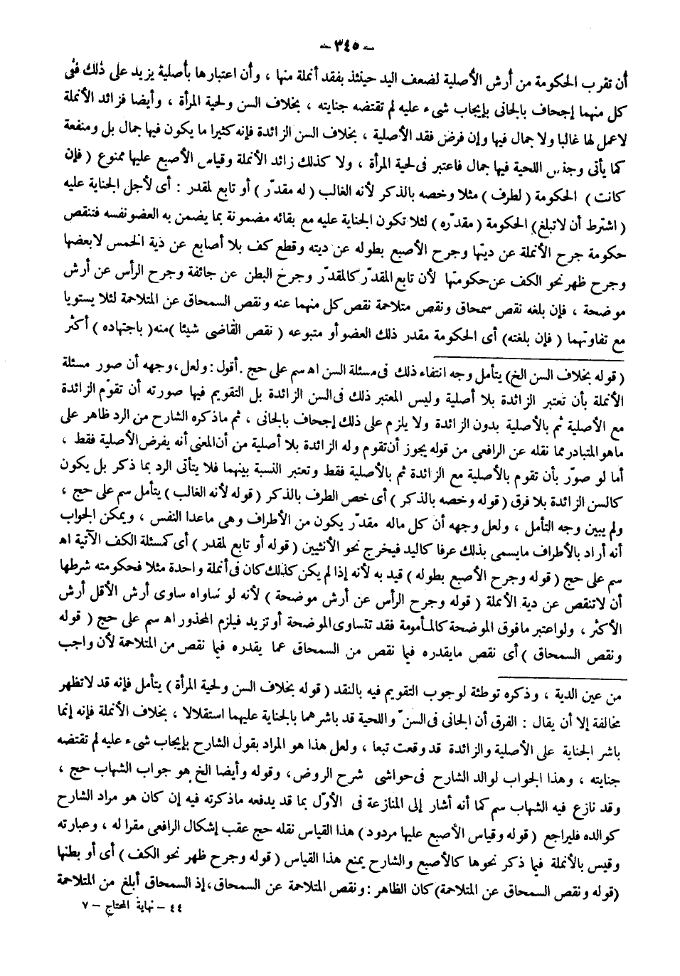 أَنْ تَقْرُبَ الْحُكُومَةُ مِنْ أَرْشِ الْأَصْلِيَّةِ لِضَعْفِ الْيَدِ حِينَئِذٍ بِفَقْدِ أُنْمُلَةٍ مِنْهَا، وَأَنَّ اعْتِبَارَهَا بِأَصْلِيَّةٍ يَزِيدُ عَلَى ذَلِكَ فَفِي كُلٍّ مِنْهُمَا إجْحَافٌ بِالْجَانِي بِإِيجَابِ شَيْءٍ عَلَيْهِ لَمْ تَقْتَضِهِ جِنَايَتُهُ، بِخِلَافِ السِّنِّ وَلِحْيَةِ الْمَرْأَةِ، وَأَيْضًا فَزَائِدُ الْأُنْمُلَةِ لَا عَمَلَ لَهَا غَالِبًا وَلَا جَمَالَ فِيهَا، وَإِنْ فُرِضَ فَقْدُ الْأَصْلِيَّةِ، بِخِلَافِ السِّنِّ الزَّائِدَةِ فَإِنَّهُ كَثِيرًا مَا يَكُونُ فِيهَا جَمَالٌ بَلْ وَمَنْفَعَةٌ كَمَا يَأْتِي وَجِنْسُ اللِّحْيَةِ فِيهَا جَمَالٌ فَاعْتُبِرَ فِي لِحْيَةِ الْمَرْأَةِ، وَلَا كَذَلِكَ زَائِدُ الْأُنْمُلَةِ وَقِيَاسُ الْأُصْبُعِ عَلَيْهَا مَمْنُوعٌ