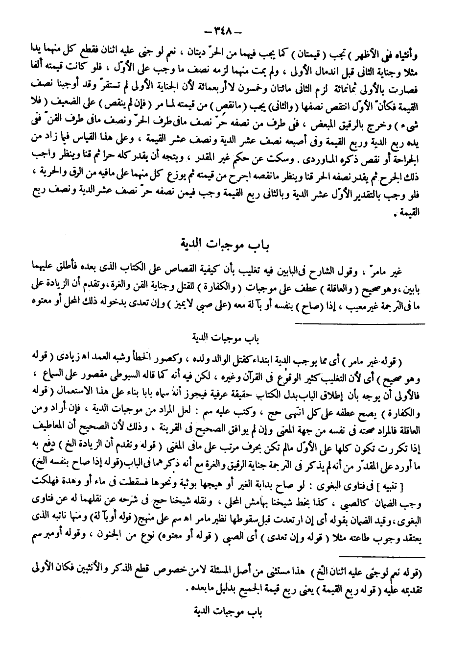 بَابُ مُوجِبَاتِ الدِّيَةِ غَيْرُ مَا مَرَّ، وَقَوْلُ الشَّارِحِ فِي الْبَابَيْنِ فِيهِ تَغْلِيبٌ بِأَنَّ كَيْفِيَّةَ الْقِصَاصِ عَلَى الْكِتَابِ الَّذِي بَعْدَهُ فَأَطْلَقَ عَلَيْهِمَا بَابَيْنِ، وَهُوَ صَحِيحٌ (وَالْعَاقِلَةُ) عَطْفٌ عَلَى: مُوجِبَاتُ (وَالْكَفَّارَةُ) لِلْقَتْلِ وَجِنَايَةِ الْقِنِّ وَالْغُرَّةِ، وَتَقَدَّمَ أَنَّ الزِّيَادَةَ عَلَى مَا فِي التَّرْجَمَةِ غَيْرُ مَعِيبٍ، إذَا (صَاحَ) بِنَفْسِهِ أَوْ بِآلَةٍ مَعَهُ (عَلَى صَبِيٍّ لَا يُمَيِّزُ) وَإِنْ تَعَدَّى بِدُخُولِهِ ذَلِكَ الْمَحَلَّ أَوْ مَعْتُوهٍ