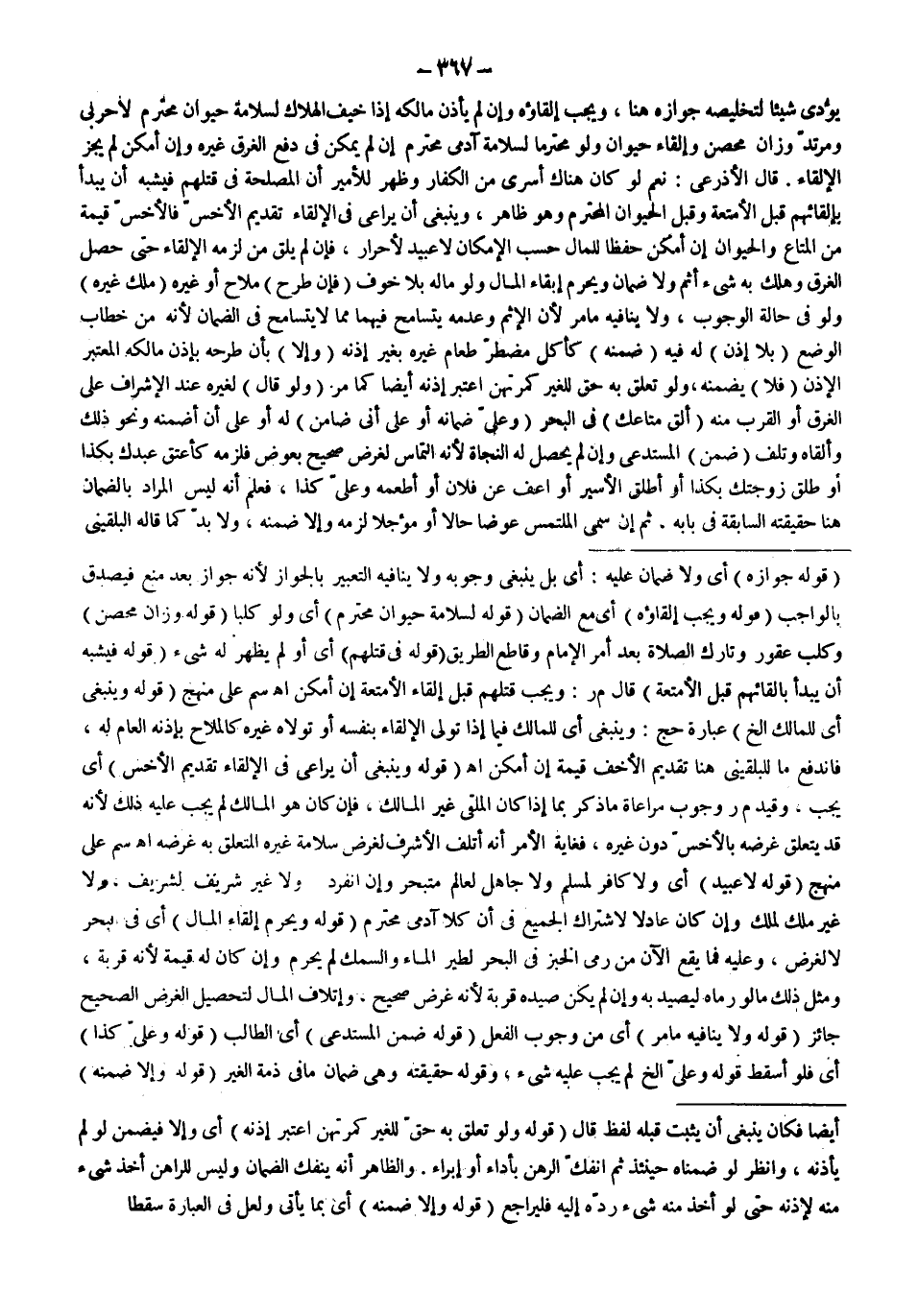 يُؤَدِّيَ شَيْئًا لِتَخْلِيصِهِ جَوَازَهُ هُنَا، وَيَجِبُ إلْقَاؤُهُ وَإِنْ لَمْ يَأْذَنْ مَالِكُهُ إذَا خِيفَ الْهَلَاكُ لِسَلَامَةِ حَيَوَانٍ مُحْتَرَمٍ لَا حَرْبِيٍّ وَمُرْتَدٍّ وَزَانٍ مُحْصَنٍ وَإِلْقَاءُ حَيَوَانٍ وَلَوْ مُحْتَرَمًا لِسَلَامَةِ آدَمِيٍّ مُحْتَرَمٍ إنْ لَمْ يُمْكِنْ فِي دَفْعِ الْغَرَقِ غَيْرُهُ وَإِنْ أَمْكَنَ لَمْ يَجُزْ الْإِلْقَاءُ.