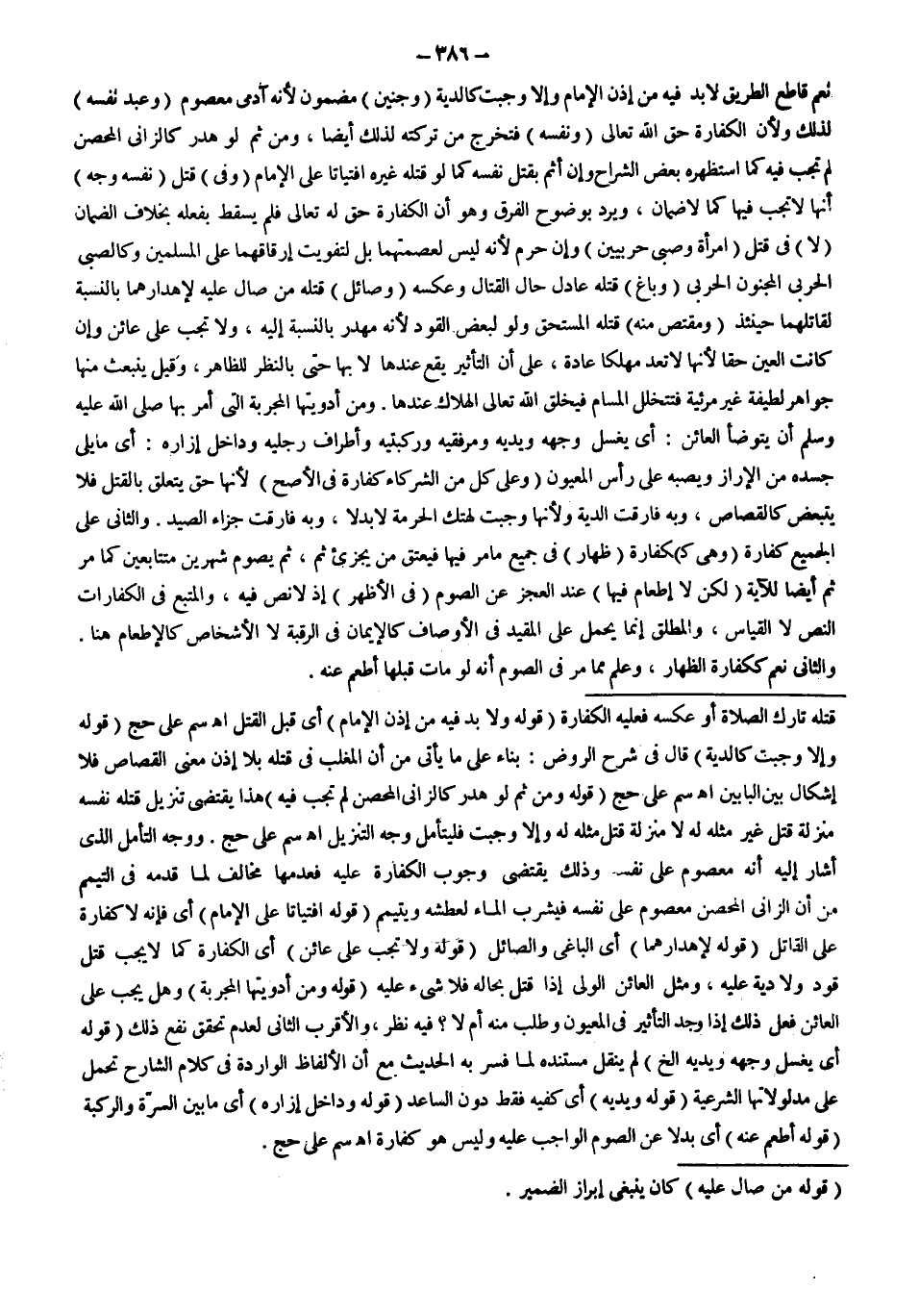 نَعَمْ قَاطِعُ الطَّرِيقِ لَا بُدَّ فِيهِ مِنْ إذْنِ الْإِمَامِ وَإِلَّا وَجَبَتْ كَالدِّيَةِ (وَجَنِينٍ) مَضْمُونٍ؛ لِأَنَّهُ آدَمِيٌّ مَعْصُومٌ (وَعَبْدِ نَفْسِهِ) لِذَلِكَ وَلِأَنَّ الْكَفَّارَةَ حَقُّ اللَّهِ تَعَالَى (وَنَفْسِهِ) فَتُخْرَجُ مِنْ تَرِكَتِهِ لِذَلِكَ أَيْضًا، وَمِنْ ثَمَّ لَوْ هُدِرَ كَالزَّانِي الْمُحْصَنِ لَمْ تَجِبْ فِيهِ كَمَا اسْتَظْهَرَهُ بَعْضُ الشُّرَّاحِ وَإِنْ أَثِمَ بِقَتْلِ نَفْسِهِ كَمَا لَوْ قَتَلَهُ غَيْرُهُ افْتِيَاتًا عَلَى الْإِمَامِ (وَفِي) قَتْلِ (نَفْسِهِ) (وَجْهٌ) أَنَّهَا لَا تَجِبُ فِيهَا كَمَا لَا ضَمَانَ، وَيَرِدُ بِوُضُوحٍ الْفَرْقُ وَهُوَ أَنَّ الْكَفَّارَةَ حَقٌّ لَهُ تَعَالَى، فَلَمْ يَسْقُطْ بِفِعْلِهِ بِخِلَافِ الضَّمَانِ (لَا) فِي قَتْلِ (امْرَأَةٍ وَصَبِيٍّ حَرْبِيَّيْنِ) وَإِنْ حَرُمَ؛ لِأَنَّهُ لَيْسَ لِعِصْمَتِهِمَا بَلْ لِتَفْوِيتِ إرْقَاقِهِمَا عَلَى الْمُسْلِمِينَ وَكَالصَّبِيِّ الْحَرْبِيِّ الْمَجْنُونُ الْحَرْبِيُّ (وَبَاغٍ) قَتَلَهُ عَادِلٌ حَالَ الْقِتَالِ وَعَكْسِهِ (وَصَائِلٍ) قَتَلَهُ مَنْ صَالَ عَلَيْهِ لِإِهْدَارِهِمَا بِالنِّسْبَةِ لِقَاتِلِهِمَا حِينَئِذٍ (وَمُقْتَصٍّ مِنْهُ) قَتَلَهُ الْمُسْتَحِقُّ وَلَوْ لِبَعْضِ الْقَوَدِ.