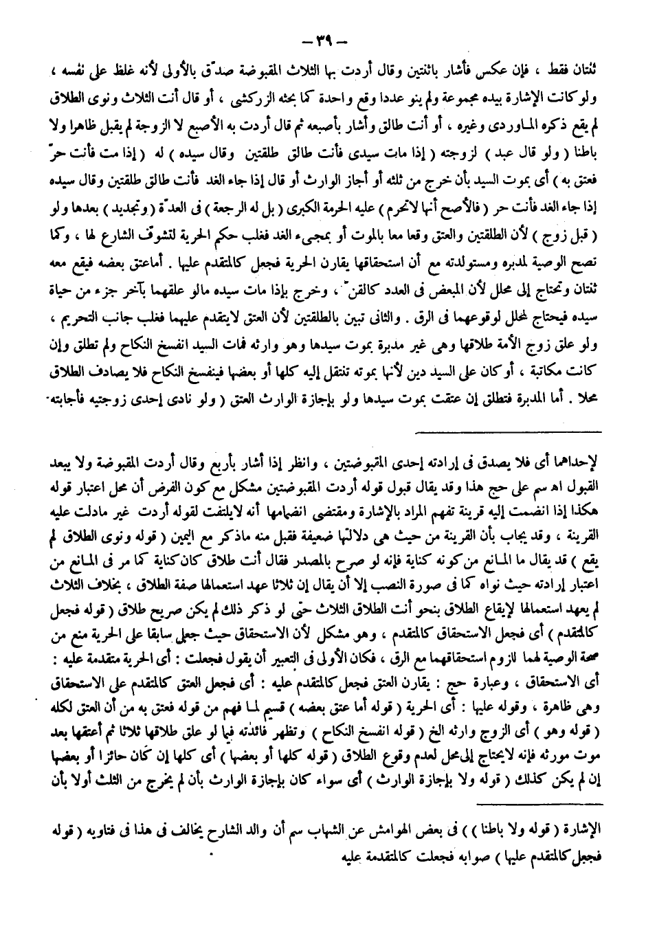 ثِنْتَانِ فَقَطْ، فَإِنْ عَكَسَ فَأَشَارَ بِاثْنَتَيْنِ وَقَالَ أَرَدْت بِهَا الثَّلَاثَ الْمَقْبُوضَةَ صُدِّقَ بِالْأُولَى لِأَنَّهُ غَلَّظَ عَلَى نَفْسِهِ، وَلَوْ كَانَتْ الْإِشَارَةُ بِيَدِهِ مَجْمُوعَةً وَلَمْ يَنْوِ عَدَدًا وَقَعَ وَاحِدَةً كَمَا بَحَثَهُ الزَّرْكَشِيُّ، أَوْ قَالَ أَنْتِ الثَّلَاثُ وَنَوَى الطَّلَاقَ لَمْ يَقَعْ ذَكَرَهُ الْمَاوَرْدِيُّ وَغَيْرُهُ، أَوْ أَنْتِ طَالِقٌ وَأَشَارَ بِأُصْبُعِهِ ثُمَّ قَالَ أَرَدْت بِهِ الْأُصْبُعَ لَا الزَّوْجَةَ لَمْ يُقْبَلْ ظَاهِرًا وَلَا بَاطِنًا.