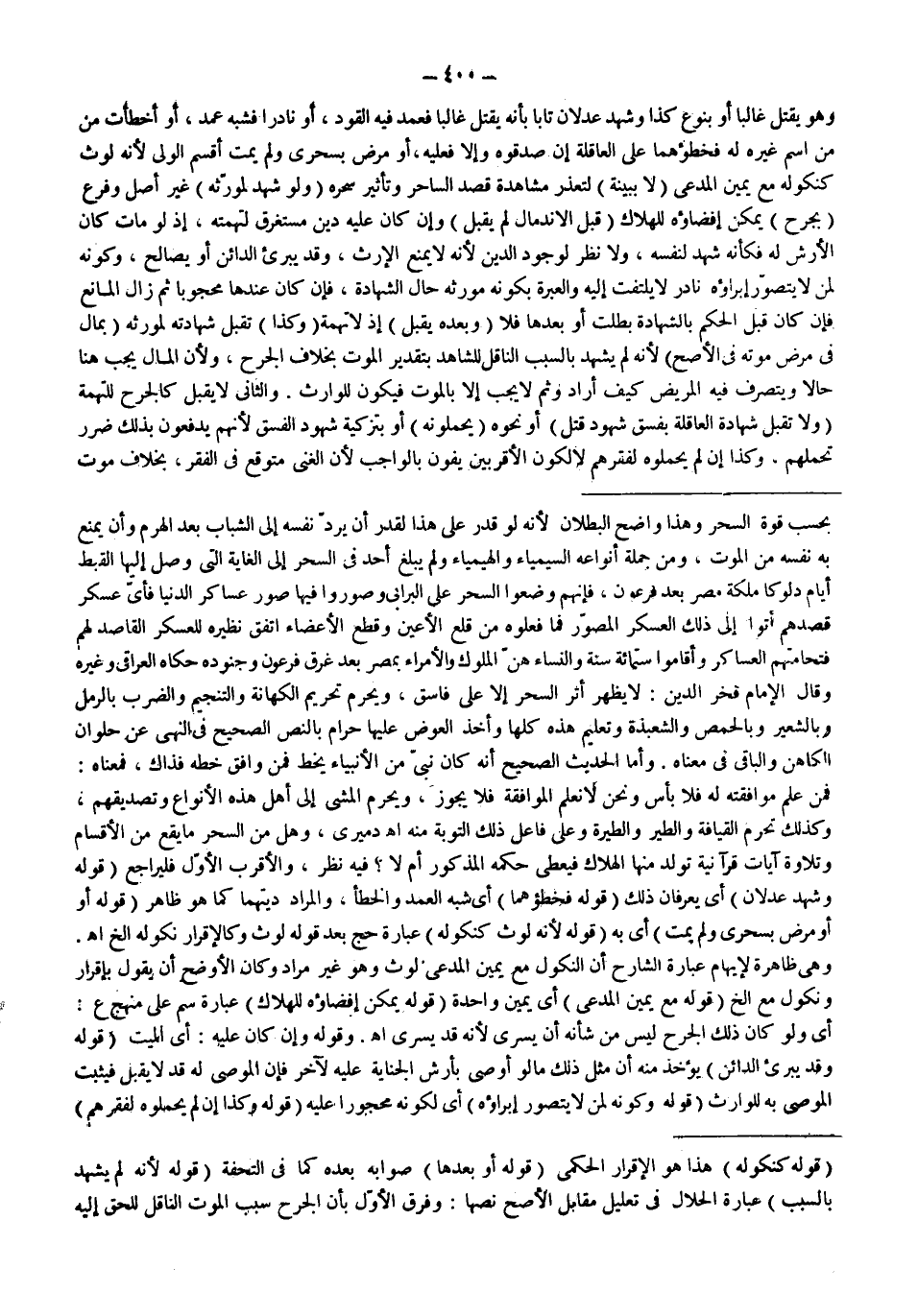ـــــــــــــــــــــــــــــSبِحَسَبِ قُوَّةِ السِّحْرِ وَهَذَا وَاضِحُ الْبُطْلَانِ؛ لِأَنَّهُ لَوْ قَدَرَ عَلَى هَذَا لَقَدَرَ أَنْ يَرُدَّ نَفْسَهُ إلَى الشَّبَابِ بَعْدَ الْهَرَمِ وَأَنْ يَمْنَعَ بِهِ نَفْسَهُ مِنْ الْمَوْتِ، وَمِنْ جُمْلَةِ أَنْوَاعِهِ السِّيمِيَاءُ وَالْهِيمْيَاءُ وَلَمْ يَبْلُغْ أَحَدٌ فِي السِّحْرِ إلَى الْغَايَةِ الَّتِي وَصَلَ إلَيْهَا الْقِبْطُ أَيَّامَ دَلُوكَا مَلِكَةِ مِصْرَ بَعْدَ فِرْعَوْنَ، فَإِنَّهُمْ وَضَعُوا السِّحْرَ عَلَى الْبَرَابِي وَصَوَّرُوا فِيهَا صُوَرَ عَسَاكِرِ الدُّنْيَا فَأَيُّ عَسْكَرٍ قَصَدَهُمْ أَتَوْا إلَى ذَلِكَ الْعَسْكَرِ الْمُصَوَّرِ فَمَا فَعَلُوهُ مِنْ قَلْعِ الْأَعْيُنِ وَقَطْعِ الْأَعْضَاءِ اتَّفَقَ نَظِيرُهُ لِلْعَسْكَرِ الْقَاصِدِ لَهُمْ فَتَحَامَتْهُمْ الْعَسَاكِرُ وَأَقَامُوا سِتَّمِائَةِ سَنَةٍ، وَالنِّسَاءُ هُنَّ الْمُلُوكُ وَالْأُمَرَاءُ بِمِصْرَ بَعْدَ غَرَقِ فِرْعَوْنَ وَجُنُودِهِ حَكَاهُ الْعِرَاقِيُّ وَغَيْرُهُ وَقَالَ الْإِمَامُ فَخْرُ الدِّينِ: لَا يَظْهَرُ أَثَرُ السِّحْرِ إلَّا عَلَى فَاسِقٍ، وَيَحْرُمُ تَحْرِيمَ الْكِهَانَةِ وَالتَّنْجِيمِ وَالضَّرْبِ بِالرَّمْلِ وَبِالشَّعِيرِ وَبِالْحِمِّصِ وَالشَّعْبَذَةُ وَتَعْلِيمُ هَذِهِ كُلِّهَا وَأَخْذُ الْعِوَضِ عَلَيْهَا حَرَامٌ بِالنَّصِّ الصَّحِيحِ فِي النَّهْيِ عَنْ حُلْوَانِ الْكَاهِنِ وَالْبَاقِي فِي مَعْنَاهُ. وَأَمَّا الْحَدِيثُ الصَّحِيحُ «أَنَّهُ كَانَ نَبِيٌّ مِنْ الْأَنْبِيَاءِ يَخُطُّ فَمَنْ وَافَقَ خَطُّهُ فَذَاكَ» ، فَمَعْنَاهُ: فَمَنْ عَلِمَ مُوَافَقَتَهُ لَهُ فَلَا بَأْسَ وَنَحْنُ لَا نَعْلَمُ الْمُوَافَقَةَ فَلَا يَجُوزُ، وَيَحْرُمُ الْمَشْيُ إلَى أَهْلِ هَذِهِ الْأَنْوَاعِ وَتَصْدِيقُهُمْ، وَكَذَلِكَ تَحْرُمُ الْقِيَافَةُ وَالطَّيْرُ وَالطِّيَرَةُ وَعَلَى فَاعِلِ ذَلِكَ التَّوْبَةُ مِنْهُ اهـ دَمِيرِيٌّ، وَهَلْ مِنْ السِّحْرِ مَا يَقَعُ مِنْ الْأَقْسَامِ وَتِلَاوَةِ آيَاتٍ قُرْآنِيَّةٍ تَوَلَّدَ مِنْهَا الْهَلَاكُ فَيُعْطَى حُكْمَهُ الْمَذْكُورَ أَمْ لَا؟ فِيهِ نَظَرٌ، وَالْأَقْرَبُ الْأَوَّلُ فَلْيُرَاجَعْ