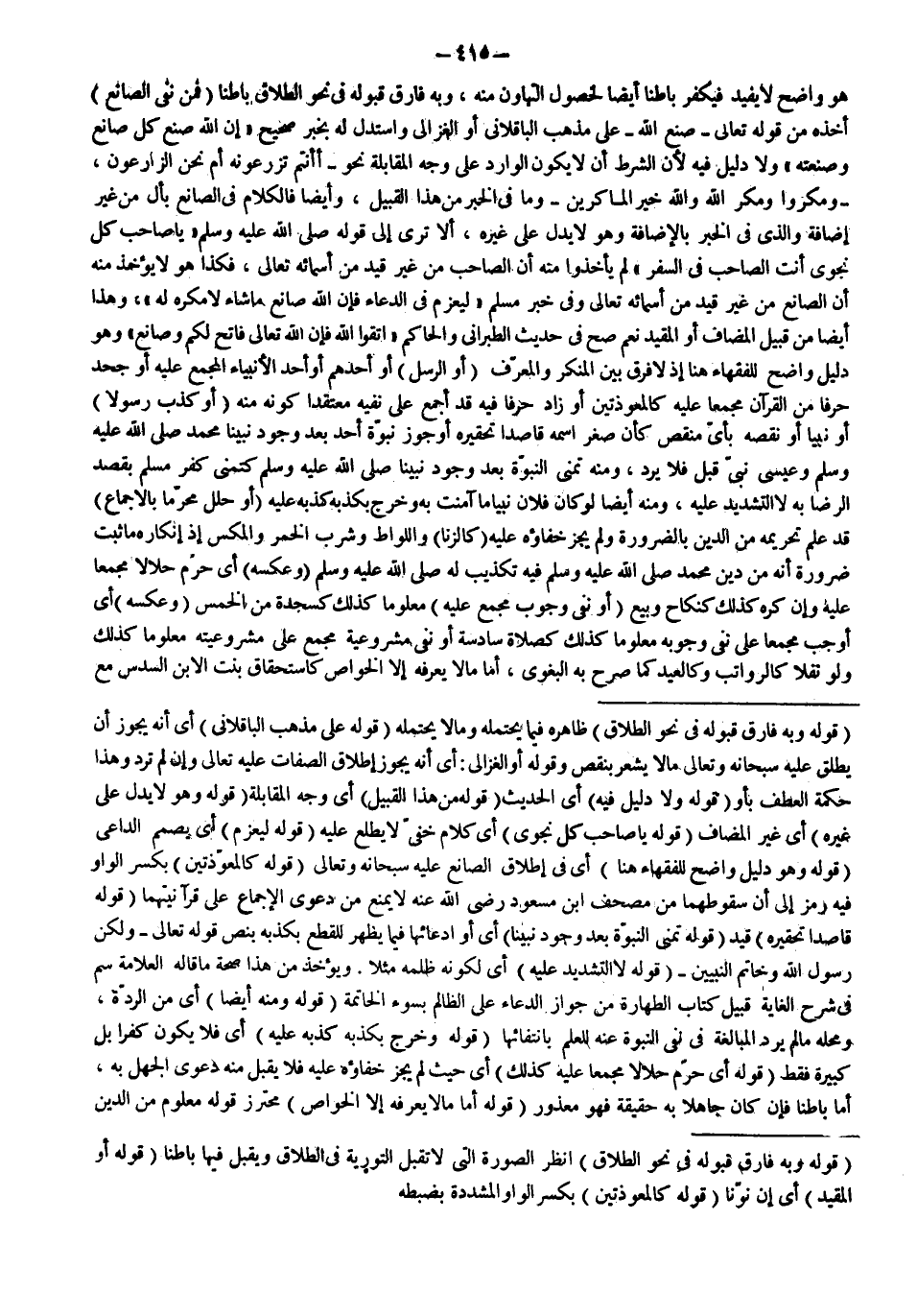 هُوَ وَاضِحٌ لَا يُفِيدُ فَيُكَفَّرُ بَاطِنًا أَيْضًا لِحُصُولِ التَّهَاوُنِ مِنْهُ، وَبِهِ فَارَقَ قَبُولَهُ فِي نَحْوِ الطَّلَاقِ بَاطِنًا (فَمَنْ نَفَى الصَّانِعَ) أَخَذَهُ مِنْ قَوْله تَعَالَى {صُنْعَ اللَّهِ} [النمل: 88] عَلَى مَذْهَبِ الْبَاقِلَّانِيِّ أَوْ الْغَزَالِيِّ وَاسْتَدَلَّ لَهُ بِخَبَرٍ صَحِيحٍ «إنَّ اللَّهَ صَنَعَ كُلَّ صَانِعٍ وَصَنْعَتَهُ» وَلَا دَلِيلَ فِيهِ؛ لِأَنَّ الشَّرْطَ أَنْ لَا يَكُونَ الْوَارِدُ عَلَى وَجْهِ الْمُقَابَلَةِ نَحْوُ {أَأَنْتُمْ تَزْرَعُونَهُ أَمْ نَحْنُ الزَّارِعُونَ} [الواقعة: 64] {وَمَكَرُوا وَمَكَرَ اللَّهُ وَاللَّهُ خَيْرُ الْمَاكِرِينَ} [آل عمران: 54] وَمَا فِي الْخَبَرِ مِنْ هَذَا الْقَبِيلِ، وَأَيْضًا فَالْكَلَامُ فِي الصَّانِعِ بِأَلْ مِنْ غَيْرِ إضَافَةٍ، وَاَلَّذِي فِي الْخَبَرِ بِالْإِضَافَةِ وَهُوَ لَا يَدُلُّ عَلَى غَيْرِهِ، أَلَا تَرَى إلَى قَوْلِهِ - صَلَّى اللَّهُ عَلَيْهِ وَسَلَّمَ - «يَا صَاحِبَ كُلِّ نَجْوَى أَنْتَ الصَّاحِبُ فِي السَّفَرِ» لَمْ يَأْخُذُوا مِنْهُ أَنَّ الصَّاحِبَ مِنْ غَيْرِ قَيْدٍ مِنْ أَسْمَائِهِ تَعَالَى، فَكَذَا هُوَ لَا يُؤْخَذُ مِنْهُ أَنَّ الصَّانِعَ مِنْ غَيْرِ قَيْدٍ مِنْ أَسْمَائِهِ تَعَالَى وَفِي خَبَرِ مُسْلِمٍ «لِيَعْزِمْ فِي الدُّعَاءِ فَإِنَّ اللَّهَ صَانِعُ مَا شَاءَ لَا مُكْرِهَ لَهُ» ، وَهَذَا أَيْضًا مِنْ قَبِيلِ الْمُضَافِ أَوْ الْمُقَيَّدِ نَعَمْ صَحَّ فِي حَدِيثِ الطَّبَرَانِيِّ وَالْحَاكِمِ «اتَّقُوا اللَّهَ فَإِنَّ اللَّهَ تَعَالَى فَاتِحٌ لَكُمْ وَصَانِعٌ» وَهُوَ دَلِيلٌ وَاضِحٌ لِلْفُقَهَاءِ هُنَا؛ إذْ لَا فَرْقَ بَيْنَ الْمُنَكَّرِ وَالْمُعَرَّفِ (أَوْ الرُّسُلَ) أَوْ أَحَدَهُمْ أَوْ أَحَدَ الْأَنْبِيَاءِ الْمُجْمَعَ عَلَيْهِ أَوْ جَحَدَ حَرْفًا مِنْ الْقُرْآنِ مُجْمَعًا عَلَيْهِ كَالْمُعَوِّذَتَيْنِ أَوْ زَادَ حَرْفًا فِيهِ قَدْ أُجْمِعَ عَلَى نَفْيِهِ مُعْتَقِدًا كَوْنَهُ مِنْهُ
