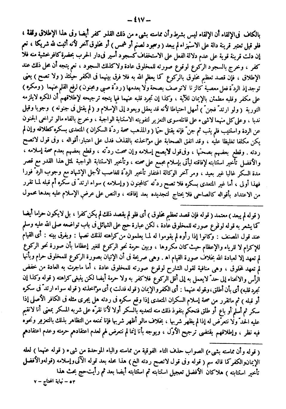بِالْكَافِ فِي الْإِلْقَاءِ أَنَّ الْإِلْقَاءَ لَيْسَ بِشَرْطٍ، وَأَنَّ مُمَاسَّتَهُ بِشَيْءٍ مِنْ ذَلِكَ الْقَذِرِ كُفْرٌ أَيْضًا وَفِي هَذَا الْإِطْلَاقِ وَقْفَةٌ، فَلَوْ قِيلَ تُعْتَبَرُ قَرِينَةً دَالَّةً عَلَى الِاسْتِهْزَاءِ لَمْ يَبْعُدْ (وَسُجُودٍ لِصَنَمٍ أَوْ شَمْسٍ) أَوْ مَخْلُوقٍ آخَرَ؛ لِأَنَّهُ أَثْبَتَ لِلَّهِ شَرِيكًا، نَعَمْ إنْ دَلَّتْ قَرِينَةٌ قَوِيَّةٌ عَلَى عَدَمِ دَلَالَةِ الْفِعْلِ عَلَى الِاسْتِخْفَافِ كَسُجُودِ أَسِيرٍ فِي دَارِ الْحَرْبِ بِحَضْرَةِ كَافِرٍ خَشْيَةً مِنْهُ فَلَا كُفْرَ، وَخَرَجَ بِالسُّجُودِ الرُّكُوعُ لِوُقُوعِ صُورَتِهِ لِلْمَخْلُوقِ عَادَةً، وَلَا كَذَلِكَ السُّجُودُ، نَعَمْ يُتَّجَهُ أَنَّ مَحَلَّ ذَلِكَ عِنْدَ الْإِطْلَاقِ، فَإِنْ قَصَدَ تَعْظِيمَ مَخْلُوقٍ بِالرُّكُوعِ كَمَا يُعَظِّمُ اللَّهَ بِهِ فَلَا فَرْقَ بَيْنَهُمَا فِي الْكُفْرِ حِينَئِذٍ