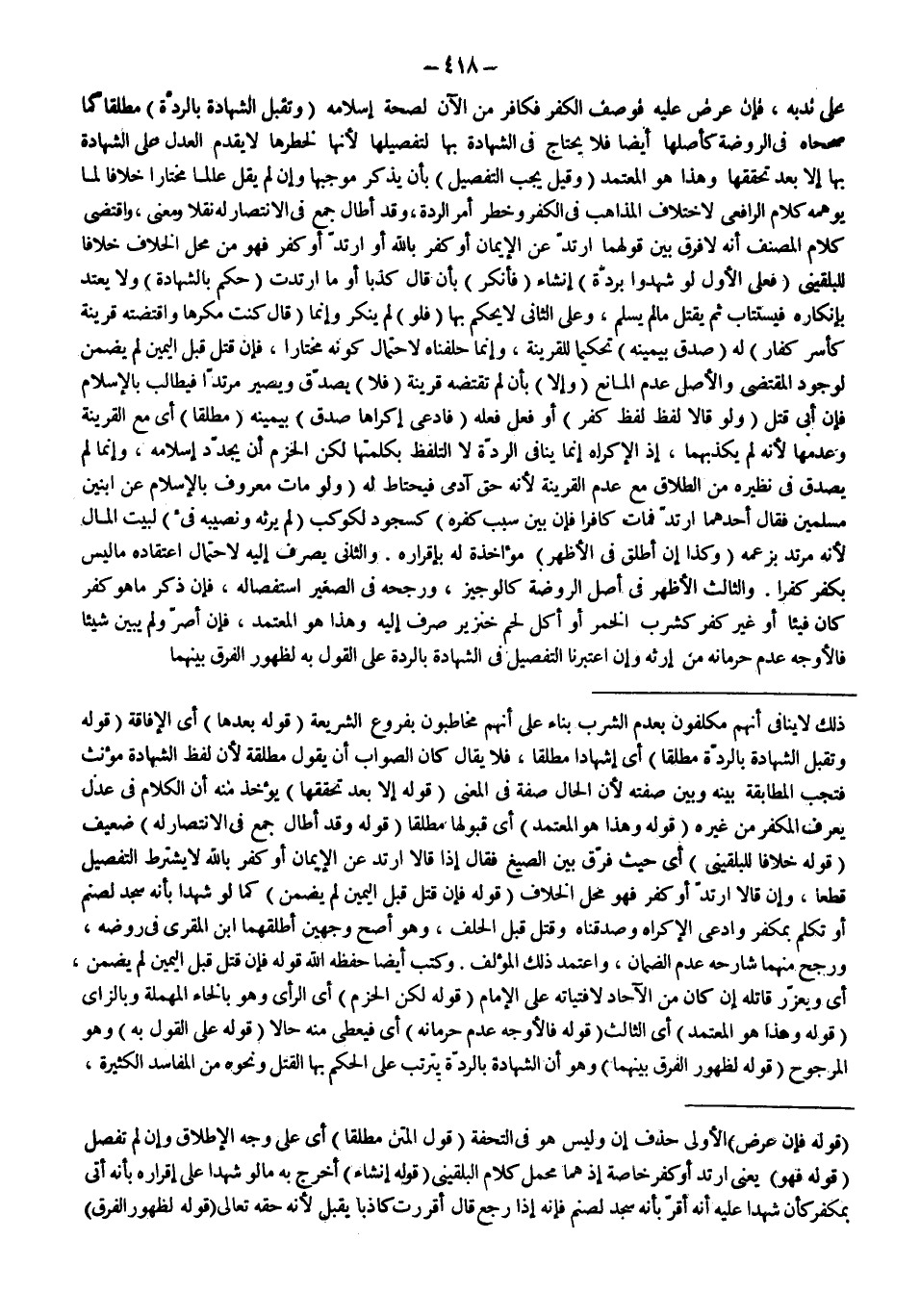 (قَوْلُهُ: وَتُقْبَلُ الشَّهَادَةُ بِالرِّدَّةِ مُطْلَقًا) أَيْ إشْهَادًا مُطْلَقًا، فَلَا يُقَالُ كَانَ الصَّوَابُ أَنْ يَقُولَ مُطْلَقَةً؛ لِأَنَّ لَفْظَ الشَّهَادَةِ مُؤَنَّثٌ فَتَجِبُ الْمُطَابِقَةُ بَيْنَهُ وَبَيْنَ صِفَتِهِ؛ لِأَنَّ الْحَالَ صِفَةٌ فِي الْمَعْنَى (قَوْلُهُ إلَّا بَعْدَ تَحَقُّقِهَا) يُؤْخَذُ مِنْهُ أَنَّ الْكَلَامَ فِي عَدْلٍ يَعْرِفُ الْمُكَفِّرَ مِنْ غَيْرِهِ (قَوْلُهُ: وَهَذَا هُوَ الْمُعْتَمَدُ) أَيْ قَبُولُهَا مُطْلَقًا