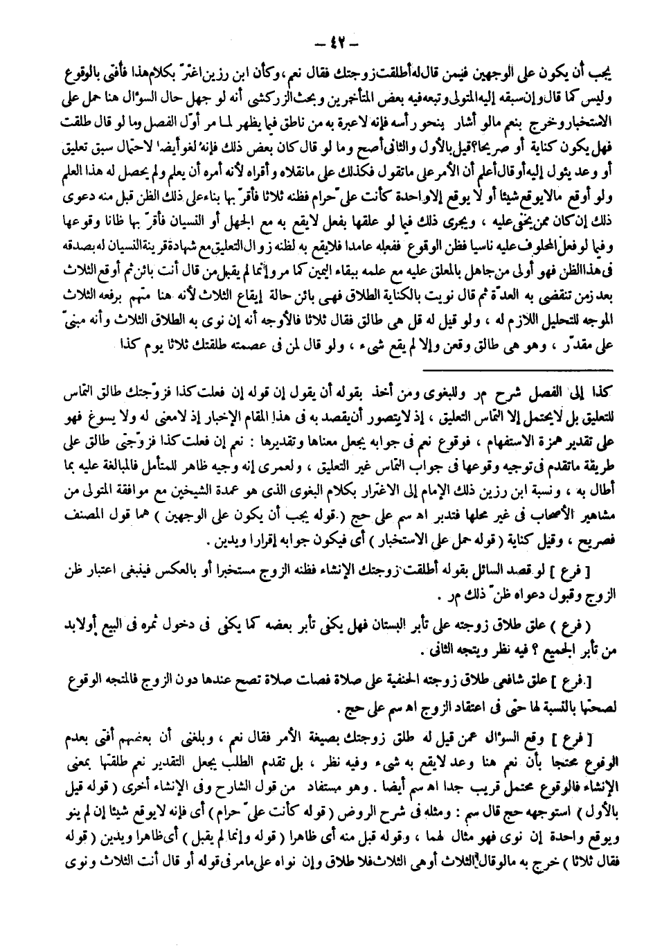 يَجِبُ أَنْ يَكُونَ عَلَى الْوَجْهَيْنِ فِيمَنْ قَالَ لَهُ أَطَلَّقْتَ زَوْجَتَك فَقَالَ نَعَمْ، وَكَأَنَّ ابْنَ رَزِينٍ اغْتَرَّ بِكَلَامِ هَذَا فَأَفْتَى بِالْوُقُوعِ وَلَيْسَ كَمَا قَالَ وَإِنْ سَبَقَهُ إلَيْهِ الْمُتَوَلِّي وَتَبِعَهُ فِيهِ بَعْضُ الْمُتَأَخِّرِينَ وَبَحَثَ الزَّرْكَشِيُّ أَنَّهُ لَوْ جَهِلَ حَالَ السُّؤَالِ هُنَا حُمِلَ عَلَى الِاسْتِخْبَارِ وَخَرَجَ بِنَعَمْ مَا لَوْ أَشَارَ بِنَحْوِ رَأْسِهِ فَإِنَّهُ لَا عِبْرَةَ بِهِ مِنْ نَاطِقٍ فِيمَا يَظْهَرُ لِمَا مَرَّ أَوَّلَ الْفَصْلِ وَمَا لَوْ قَالَ طَلَّقْت فَهَلْ يَكُونُ كِنَايَةً أَوْ صَرِيحًا؟