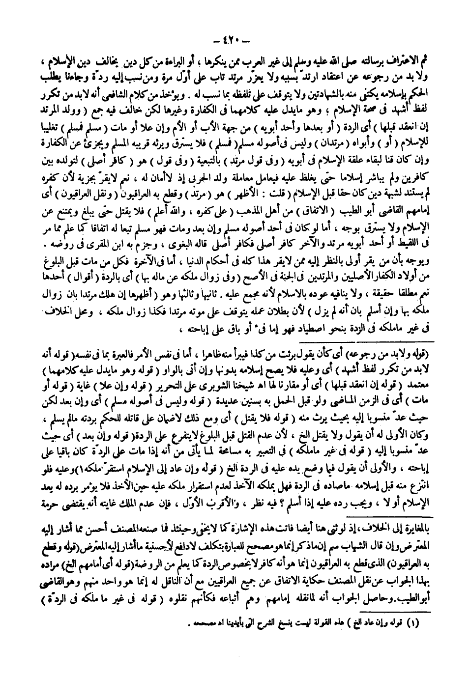 (قَوْلُهُ: وَقَطَعَ بِهِ الْعِرَاقِيُّونَ) الَّذِي قَطَعَ بِهِ الْعِرَاقِيُّونَ إنَّمَا هُوَ أَنَّهُ كَافِرٌ لَا بِخُصُوصِ الرِّدَّةِ كَمَا يُعْلَمُ مِنْ الرَّوْضَةِ (قَوْلُهُ: أَيْ إمَامُهُمْ إلَخْ.) مُرَادُهُ بِهَذَا الْجَوَابِ عَنْ نَقْلِ الْمُصَنِّفِ حِكَايَةَ الِاتِّفَاقِ عَنْ جَمِيعِ الْعِرَاقِيِّينَ مَعَ أَنَّ النَّاقِلَ لَهُ إنَّمَا هُوَ وَاحِدٌ مِنْهُمْ وَهُوَ الْقَاضِي أَبُو الطَّيِّبِ. وَحَاصِلُ الْجَوَابِ أَنَّهُ لِمَا نَقَلَهُ إمَامُهُمْ وَهْم أَتْبَاعُهُ فَكَأَنَّهُمْ نَقَلُوهُ