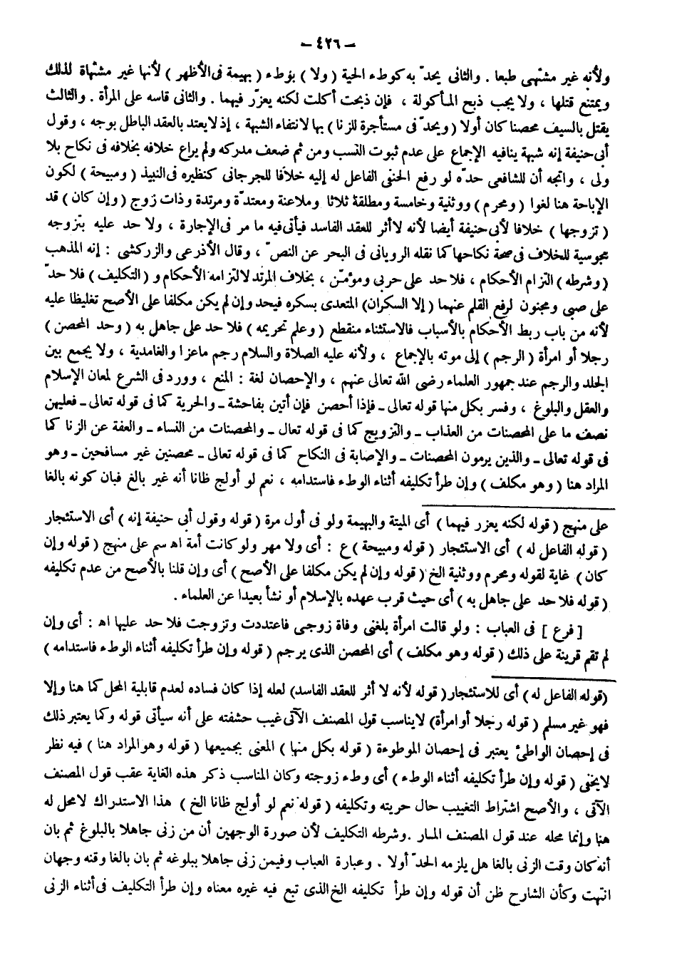 (وَحَدُّ الْمُحْصَنِ) رَجُلًا أَوْ امْرَأَةً (الرَّجْمُ) إلَى مَوْتِهِ بِالْإِجْمَاعِ؛ لِأَنَّهُ «- عَلَيْهِ الصَّلَاةُ وَالسَّلَامُ - رَجَمَ مَاعِزًا وَالْغَامِدِيَّةَ» ، وَلَا يُجْمَعُ بَيْنَ الْجَلْدِ وَالرَّجْمِ عِنْدَ جُمْهُورِ الْعُلَمَاءِ - رَضِيَ اللَّهُ تَعَالَى عَنْهُمْ - وَالْإِحْصَانُ لُغَةً: الْمَنْعُ، وَوَرَدَ فِي الشَّرْعِ لِمَعَانٍ: الْإِسْلَامِ وَالْعَقْلِ وَالْبُلُوغِ، وَفُسِّرَ بِكُلٍّ مِنْهَا قَوْله تَعَالَى {فَإِذَا أُحْصِنَّ فَإِنْ أَتَيْنَ بِفَاحِشَةٍ} [النساء: 25] وَالْحُرِّيَّةِ كَمَا فِي قَوْله تَعَالَى {فَعَلَيْهِنَّ نِصْفُ مَا عَلَى الْمُحْصَنَاتِ مِنَ الْعَذَابِ} [النساء: 25] وَالتَّزْوِيجِ كَمَا فِي قَوْله تَعَالَى {وَالْمُحْصَنَاتُ مِنَ النِّسَاءِ} [النساء: 24] وَالْعِفَّةِ عَنْ الزِّنَا كَمَا فِي قَوْله تَعَالَى {وَالَّذِينَ يَرْمُونَ الْمُحْصَنَاتِ} [النور: 4] وَالْإِصَابَةِ فِي النِّكَاحِ كَمَا فِي قَوْله تَعَالَى {مُحْصِنِينَ غَيْرَ مُسَافِحِينَ} [النساء: 24] وَهُوَ الْمُرَادُ هُنَا (وَهُوَ مُكَلَّفٌ) وَإِنْ طَرَأَ تَكْلِيفُهُ أَثْنَاءَ الْوَطْءِ فَاسْتَدَامَهُ، نَعَمْ لَوْ أَوْلَجَ ظَانًّا أَنَّهُ غَيْرُ بَالِغٍ فَبَانَ كَوْنُهُ بَالِغًا