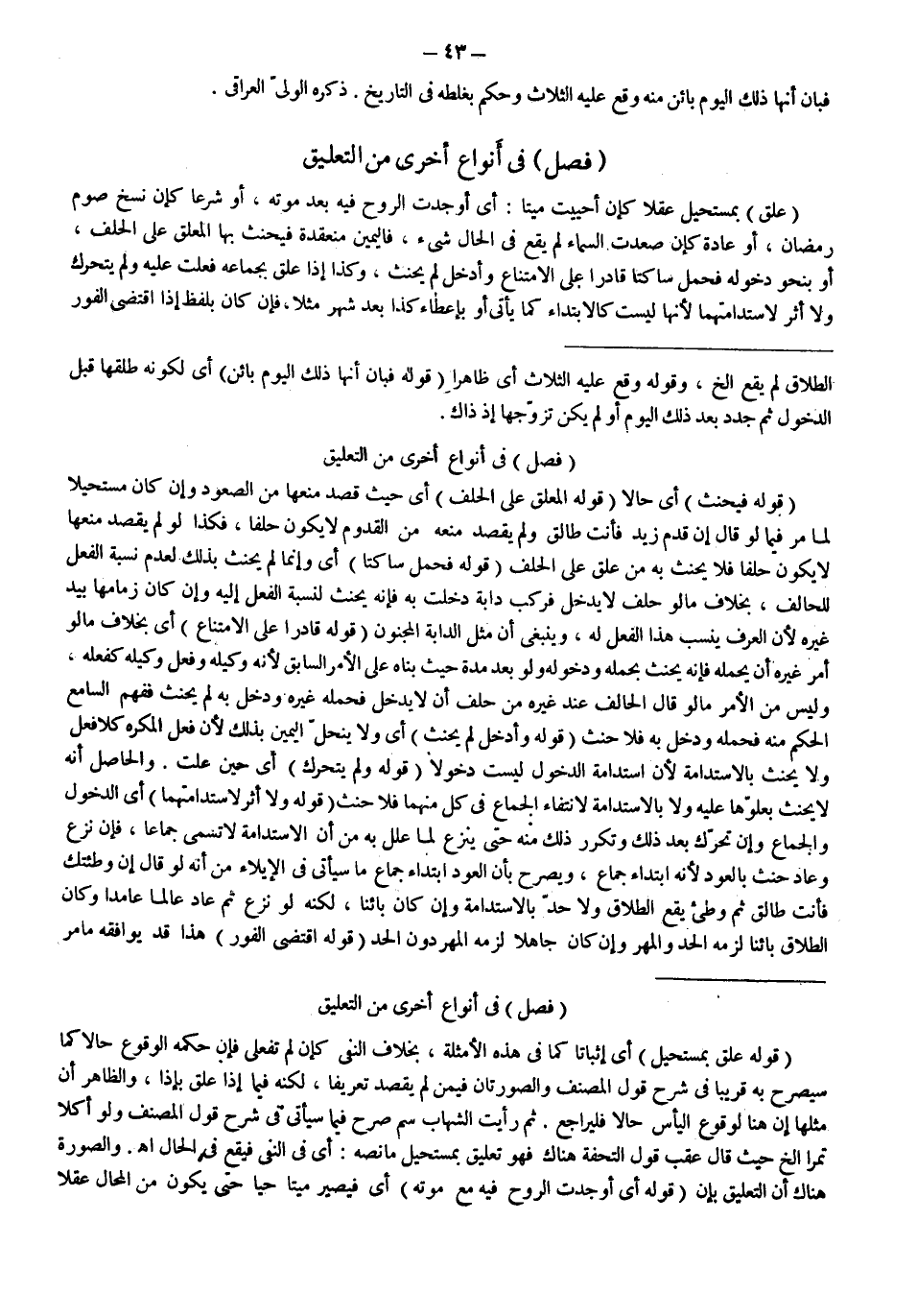 ـــــــــــــــــــــــــــــQفَصْلٌ) فِي أَنْوَاعٍ أُخْرَى مِنْ التَّعْلِيقِ (قَوْلُهُ: عُلِّقَ بِمُسْتَحِيلٍ) أَيْ: إثْبَاتًا كَمَا فِي هَذِهِ الْأَمْثِلَةِ، بِخِلَافِ النَّفْيِ كَإِنْ لَمْ تَفْعَلِي فَإِنَّ حُكْمَهُ الْوُقُوعُ حَالًا كَمَا سَيُصَرِّحُ بِهِ قَرِيبًا فِي شَرْحِ قَوْلِ الْمُصَنِّفِ وَالصُّورَتَانِ فِيمَنْ لَمْ يَقْصِدْ تَعْرِيفًا، لَكِنَّهُ فِيمَا إذَا عُلِّقَ بِإِذَا، وَالظَّاهِرُ أَنَّ مِثْلَهَا إنْ هُنَا لِوُقُوعِ الْيَأْسِ حَالًا فَلْيُرَاجَعْ. ثُمَّ رَأَيْتُ الشِّهَابَ سم صَرَّحَ فِيمَا سَيَأْتِي فِي شَرْحِ قَوْلِ الْمُصَنِّفِ وَلَوْ أَكَلَا تَمْرًا إلَخْ. حَيْثُ قَالَ عَقِبَ قَوْلِ التُّحْفَةِ هُنَاكَ فَهُوَ تَعْلِيقٌ بِمُسْتَحِيلٍ مَا نَصُّهُ: أَيْ فِي النَّفْيِ، فَيَقَعُ فِي الْحَالِ. اهـ.