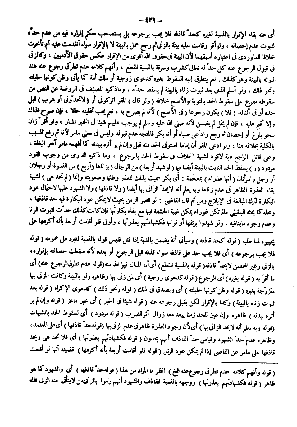 أَيْ عَنْهُ بَقَاءَ الْإِقْرَارِ بِالنِّسْبَةِ لِغَيْرِهِ كَحَدِّ قَاذِفِهِ فَلَا يَجِبُ بِرُجُوعِهِ بَلْ يُسْتَصْحَبُ حُكْمُ إقْرَارِهِ فِيهِ مِنْ عَدَمِ حَدِّهِ لِثُبُوتِ عَدَمِ إحْصَانِهِ، وَلَوْ أَقَرَّ وَقَامَتْ عَلَيْهِ بَيِّنَةٌ بِالزِّنَى ثُمَّ رَجَعَ عُمِلَ بِالْبَيِّنَةِ لَا بِالْإِقْرَارِ سَوَاءٌ أَتَقَدَّمَتْ عَلَيْهِ أَمْ تَأَخَّرَتْ خِلَافًا لِلْمَاوَرْدِيِّ فِي اعْتِبَارِهِ أَسْبَقَهُمَا؛ لِأَنَّ الْبَيِّنَةَ فِي حُقُوقِ اللَّهِ أَقْوَى مِنْ الْإِقْرَارِ عَكْسُ حُقُوقِ الْآدَمِيِّينَ، وَكَالزِّنَى فِي قَبُولِ الرُّجُوعِ عَنْهُ كُلُّ حَدٍّ لَهُ تَعَالَى كَشُرْبٍ وَسَرِقَةٍ بِالنِّسْبَةِ لِلْقَطْعِ، وَأَفْهَمَ كَلَامُهُ عَدَمَ تَطَرُّقِ رُجُوعٍ عَنْهُ عِنْدَ ثُبُوتِهِ بِالْبَيِّنَةِ وَهُوَ كَذَلِكَ.