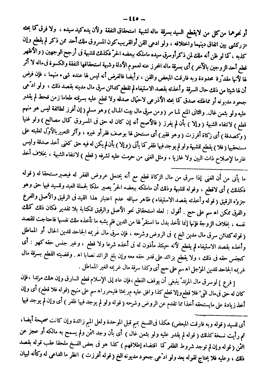 أَوْ نَحْوِهِمَا مِنْ كُلِّ مَنْ لَا يَقْطَعُ السَّيِّدُ بِسَرِقَةِ مَالِهِ لِشُبْهَةِ اسْتِحْقَاقِ النَّفَقَةِ وَلِأَنَّ يَدَهُ كَيَدِ سَيِّدِهِ، وَلَا فَرْقَ كَمَا بَحَثَهُ الزَّرْكَشِيُّ بَيْنَ اتِّفَاقِ دِينِهِمَا وَاخْتِلَافِهِ، وَلَوْ ادَّعَى الْقِنُّ أَوْ الْقَرِيبُ كَوْنَ الْمَسْرُوقِ مِلْكَ أَحَدٍ مِمَّنْ ذُكِرَ لَمْ يُقْطَعْ وَإِنْ كَذَّبَهُ، كَمَا لَوْ ظَنَّ أَنَّهُ مِلْكٌ لِمَنْ ذُكِرَ أَوْ سَرَقَ سَيِّدُهُ مَا مَلَكَهُ بِبَعْضِهِ الْحُرِّ فَكَذَلِكَ لِلشُّبْهَةِ فِي أَرْجَحِ الْوَجْهَيْنِ.