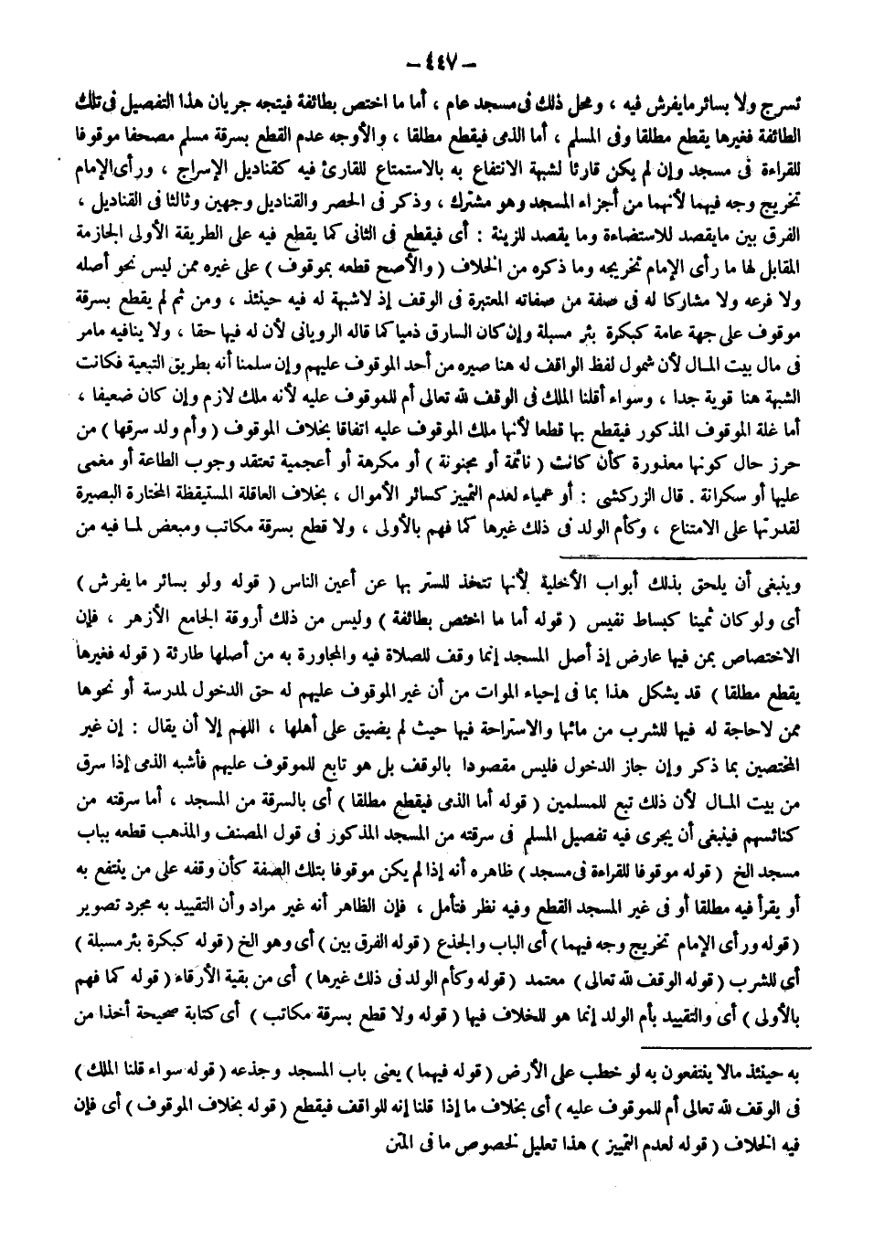 تُسْرَجُ وَلَا بِسَائِرِ مَا يُفْرَشُ فِيهِ، وَمَحَلُّ ذَلِكَ فِي مَسْجِدٍ عَامٍّ، أَمَّا مَا اُخْتُصَّ بِطَائِفَةٍ فَيُتَّجَهُ جَرَيَانُ هَذَا التَّفْصِيلِ فِي تِلْكَ الطَّائِفَةِ فَغَيْرُهَا يُقْطَعُ مُطْلَقًا وَفِي الْمُسْلِمِ، أَمَّا الذِّمِّيُّ فَيُقْطَعُ مُطْلَقًا، وَالْأَوْجَهُ عَدَمُ الْقَطْعِ بِسَرِقَةِ مُسْلِمٍ مُصْحَفًا مَوْقُوفًا لِلْقِرَاءَةِ فِي مَسْجِدٍ وَإِنْ لَمْ يَكُنْ قَارِئًا لِشُبْهَةِ الِانْتِفَاعِ بِهِ بِالِاسْتِمْتَاعِ لِلْقَارِئِ فِيهِ كَقَنَادِيلِ الْإِسْرَاجِ، وَرَأَى الْإِمَامُ تَخْرِيجَ وَجْهٍ فِيهِمَا؛ لِأَنَّهُمَا مِنْ أَجْزَاءِ الْمَسْجِدِ وَهُوَ مُشْتَرَكٌ، وَذَكَرَ فِي الْحُصُرِ وَالْقَنَادِيلِ وَجْهَيْنِ وَثَالِثًا فِي الْقَنَادِيلِ، الْفَرْقُ بَيْنَ مَا يُقْصَدُ لِلِاسْتِضَاءَةِ وَمَا يُقْصَدُ لِلزِّينَةِ: أَيْ فَيُقْطَعُ فِي الثَّانِي كَمَا يُقْطَعُ فِيهِ عَلَى الطَّرِيقَةِ الْأُولَى الْجَازِمَةِ الْمُقَابِلِ لَهَا مَا رَأَى الْإِمَامُ تَخْرِيجَهُ وَمَا ذَكَرَهُ مِنْ الْخِلَافِ.