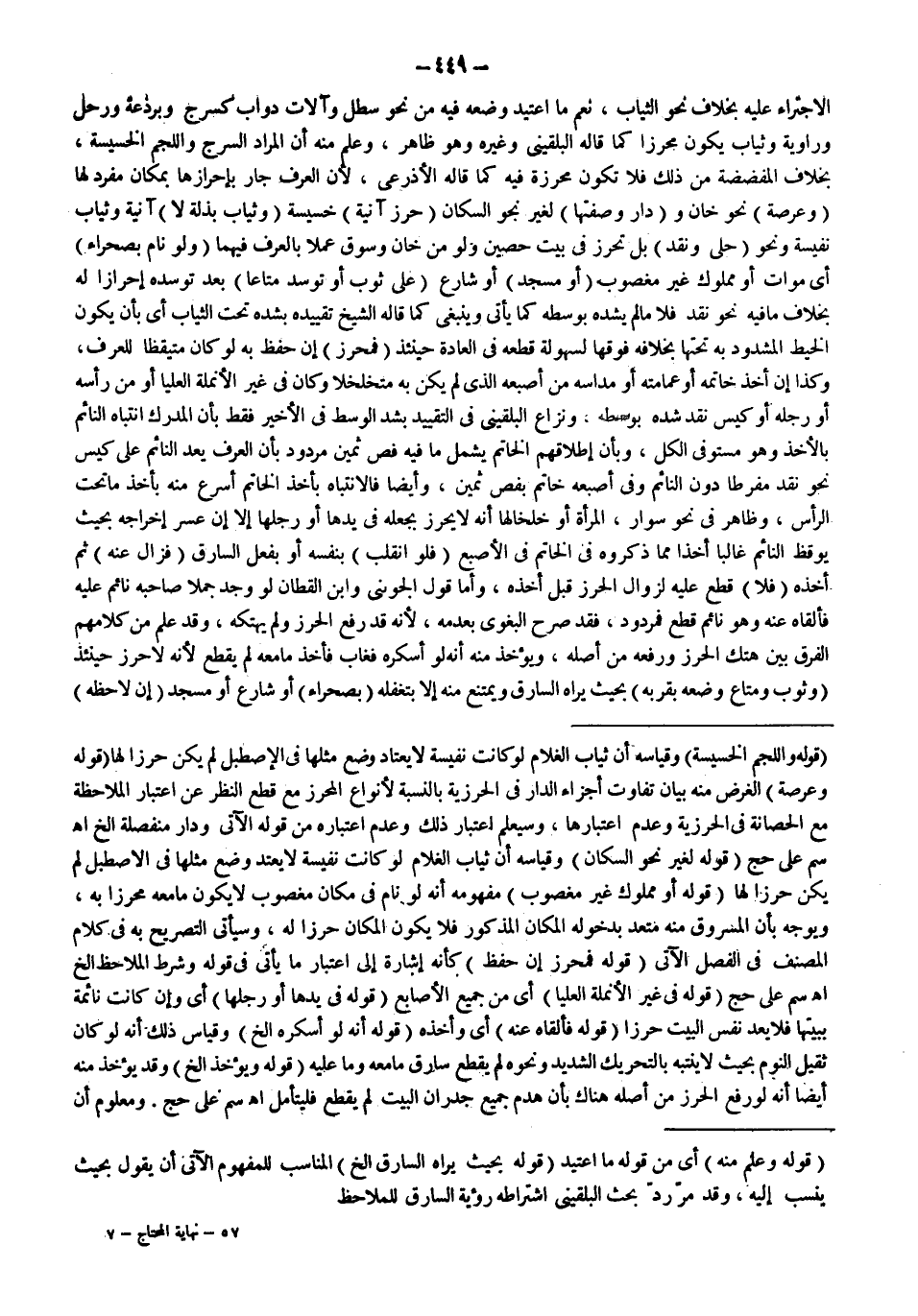 الِاجْتِرَاءُ عَلَيْهِ بِخِلَافِ نَحْوِ الثِّيَابِ، نَعَمْ مَا اُعْتِيدَ وَضْعُهُ فِيهِ مِنْ نَحْوِ سَطْلٍ وَآلَاتِ دَوَابَّ كَسَرْجٍ وَبَرْدَعَةٍ وَرَحْلٍ وَرَاوِيَةٍ وَثِيَابٍ يَكُونُ مُحْرَزًا كَمَا قَالَهُ الْبُلْقِينِيُّ وَغَيْرُهُ وَهُوَ ظَاهِرٌ، وَعُلِمَ مِنْهُ أَنَّ الْمُرَادَ السُّرُجُ وَاللُّجُمُ الْخَسِيسَةُ، بِخِلَافِ الْمُفَضَّضَةِ مِنْ ذَلِكَ فَلَا تَكُونُ مُحْرَزَةً فِيهِ كَمَا قَالَهُ الْأَذْرَعِيُّ؛ لِأَنَّ الْعُرْفَ جَارٍ بِإِحْرَازِهَا بِمَكَانٍ مُفْرَدٍ لَهَا