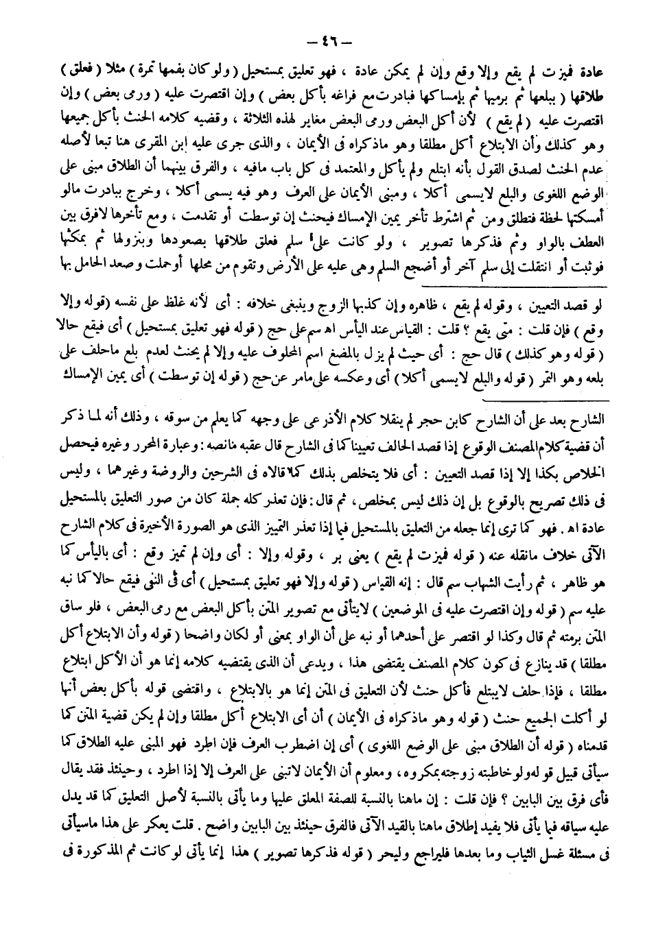 ـــــــــــــــــــــــــــــQالشَّارِحُ بَعْدُ عَلَى أَنَّ الشَّارِحَ كَابْنِ حَجَرٍ لَمْ يَنْقُلَا كَلَامَ الْأَذْرَعِيِّ عَلَى وَجْهِهِ كَمَا يُعْلَمُ مِنْ سَوْقِهِ، وَذَلِكَ أَنَّهُ لَمَّا ذَكَرَ أَنَّ قَضِيَّةَ كَلَامِ الْمُصَنِّفِ الْوُقُوعُ إذَا قَصَدَ الْحَالِفُ تَعْيِينًا كَمَا فِي الشَّارِحِ قَالَ عَقِبَهُ مَا نَصُّهُ: وَعِبَارَةُ الْمُحَرَّرِ وَغَيْرِهِ، فَيَحْصُلُ الْخَلَاصُ بِكَذَا إلَّا إذَا قَصَدَ التَّعْيِينَ: أَيْ فَلَا يَتَخَلَّصُ بِذَلِكَ كَمَا قَالَاهُ فِي الشَّرْحَيْنِ وَالرَّوْضَةِ وَغَيْرِهِمَا، وَلَيْسَ فِي ذَلِكَ تَصْرِيحٌ بِالْوُقُوعِ بَلْ إنَّ ذَلِكَ لَيْسَ بِمُخَلِّصٍ، ثُمَّ قَالَ: فَإِنْ تَعَذَّرَ كُلُّهُ جُمْلَةً كَانَ مِنْ صُوَرِ التَّعْلِيقِ بِالْمُسْتَحِيلِ عَادَةً. اهـ.