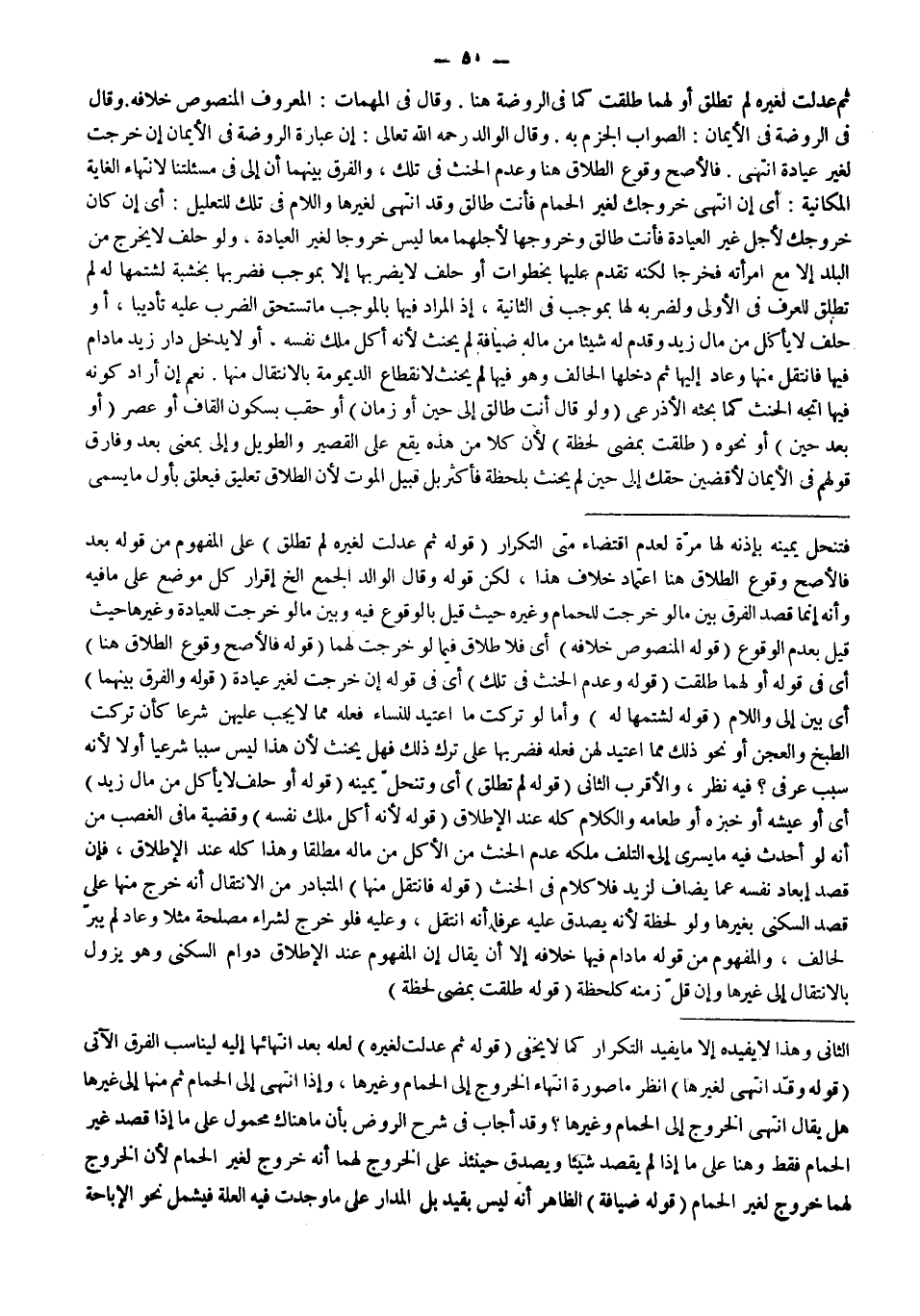 ثُمَّ عَدَلَتْ لِغَيْرِهِ لَمْ تَطْلُقْ أَوْ لَهُمَا طَلُقَتْ كَمَا فِي الرَّوْضَةِ هُنَا. وَقَالَ فِي الْمُهِمَّاتِ: الْمَعْرُوفُ الْمَنْصُوصُ خِلَافُهُ. وَقَالَ فِي الرَّوْضَةِ فِي الْأَيْمَانِ: الصَّوَابُ الْجَزْمُ بِهِ. وَقَالَ الْوَالِدُ - رَحِمَهُ اللَّهُ تَعَالَى -: إنَّ عِبَارَةَ الرَّوْضَةِ فِي الْأَيْمَانِ إنْ خَرَجَتْ لِغَيْرِ عِيَادَةٍ انْتَهَى. فَالْأَصَحُّ وُقُوعُ الطَّلَاقِ هُنَا وَعَدَمُ الْحِنْثِ فِي تِلْكَ، وَالْفَرْقُ بَيْنَهُمَا أَنَّ إلَيَّ فِي مَسْأَلَتِنَا لِانْتِهَاءِ الْغَايَةِ الْمَكَانِيَّةِ: أَيْ إنْ انْتَهَى خُرُوجُك لِغَيْرِ الْحَمَّامِ فَأَنْتِ طَالِقٌ وَقَدْ انْتَهَى لِغَيْرِهَا وَاللَّامُ فِي تِلْكَ لِلتَّعْلِيلِ: أَيْ إنْ كَانَ خُرُوجُك لِأَجْلِ غَيْرِ الْعِيَادَةِ فَأَنْتِ طَالِقٌ وَخُرُوجُهَا لِأَجْلِهِمَا مَعًا لَيْسَ خُرُوجًا لِغَيْرِ الْعِيَادَةِ، وَلَوْ حَلَفَ لَا يَخْرُجُ مِنْ الْبَلَدِ إلَّا مَعَ امْرَأَتِهِ فَخَرَجَا لَكِنَّهُ تَقَدَّمَ عَلَيْهَا بِخُطُوَاتٍ أَوْ حَلَفَ لَا يَضْرِبُهَا إلَّا بِمُوجِبٍ فَضَرَبَهَا بِخَشَبَةٍ لِشَتْمِهَا لَهُ لَمْ تَطْلُقْ لِلْعُرْفِ فِي الْأُولَى وَلِضَرْبِهِ لَهَا بِمُوجِبٍ فِي الثَّانِيَةِ، إذْ الْمُرَادُ فِيهَا بِالْمُوجِبِ مَا تَسْتَحِقُّ الضَّرْبَ عَلَيْهِ تَأْدِيبًا، أَوْ حَلَفَ لَا يَأْكُلُ مِنْ مَالِ زَيْدٍ وَقَدَّمَ لَهُ شَيْئًا مِنْ مَالِهِ ضِيَافَةً لَمْ يَحْنَثُ لِأَنَّهُ أَكَلَ مِلْكَ نَفْسِهِ، أَوْ لَا يَدْخُلُ دَارَ زَيْدٍ مَا دَامَ فِيهَا فَانْتَقَلَ مِنْهَا وَعَادَ إلَيْهَا ثُمَّ دَخَلَهَا الْحَالِفُ وَهُوَ فِيهَا لَمْ يَحْنَثْ لِانْقِطَاعِ الدَّيْمُومَةِ بِالِانْتِقَالِ مِنْهَا. نَعَمْ إنْ أَرَادَ كَوْنَهُ فِيهَا اتَّجَهَ الْحِنْثُ كَمَا بَحَثَهُ الْأَذْرَعِيُّ.