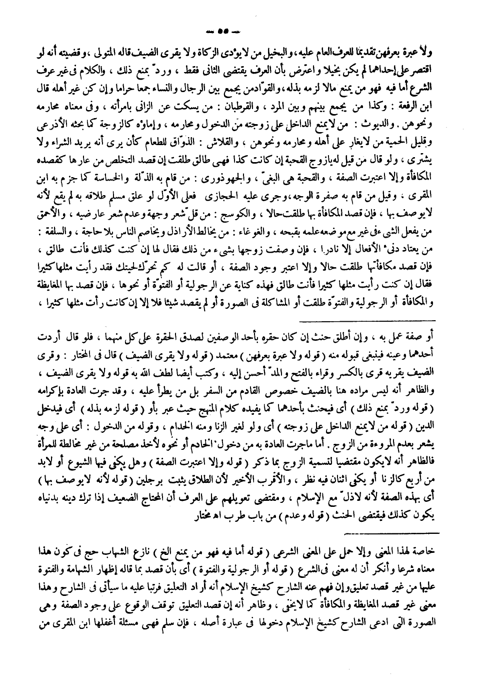 ـــــــــــــــــــــــــــــSأَوْ صِفَةً عَمِلَ بِهِ، وَإِنْ أَطْلَقَ حَنِثَ إنْ كَانَ حَقَّرَهُ بِأَحَدِ الْوَصْفَيْنِ لِصِدْقِ الْحُقْرَةِ عَلَى كُلٍّ مِنْهُمَا، فَلَوْ قَالَ أَرَدْت أَحَدَهُمَا وَعَيَّنَهُ فَيَنْبَغِي قَبُولُهُ مِنْهُ (قَوْلُهُ وَلَا عِبْرَةَ بِعُرْفِهِنَّ) مُعْتَمَدٌ (قَوْلُهُ: وَلَا يَقْرِي الضَّيْفَ) قَالَ فِي الْمُخْتَارِ: وَقَرَى الضَّيْفَ يَقْرِيهِ قِرًى بِالْكَسْرِ وَقَرَاءً بِالْفَتْحِ وَالْمَدِّ أَحْسَنَ إلَيْهِ، وَكَتَبَ أَيْضًا لَطَفَ اللَّهُ بِهِ قَوْلَهُ وَلَا يَقْرِي الضَّيْفَ، وَالظَّاهِرُ أَنَّهُ لَيْسَ مُرَادُهُ هُنَا بِالضَّيْفِ خُصُوصَ الْقَادِمِ مِنْ السَّفَرِ بَلْ مَنْ يَطْرَأُ عَلَيْهِ، وَقَدْ جَرَتْ الْعَادَةُ بِإِكْرَامِهِ (قَوْلُهُ: وَرُدَّ بِمَنْعِ ذَلِكَ) أَيْ فَيَحْنَثُ بِأَحَدِهِمَا كَمَا يُفِيدُهُ كَلَامُ الْمَنْهَجِ حَيْثُ عَبَّرَ بِأَوْ (قَوْلُهُ: لَزِمَهُ بَذْلُهُ) أَيْ فَيَدْخُلُ الدَّيْنُ (قَوْلُهُ مَنْ لَا يَمْنَعُ الدَّاخِلَ عَلَى زَوْجَتِهِ) أَيْ وَلَوْ لِغَيْرِ الزِّنَا وَمِنْهُ الْخُدَّامُ، وَقَوْلُهُ مِنْ الدُّخُولِ: أَيْ عَلَى وَجْهٍ يُشْعِرُ بِعَدَمِ الْمُرُوءَةِ مِنْ الزَّوْجِ. أَمَّا مَا جَرَتْ الْعَادَةُ بِهِ مِنْ دُخُولِ الْخَادِمِ أَوْ نَحْوِهِ لِأَخْذِ مَصْلَحَةٍ مِنْ غَيْرِ مُخَالَطَةٍ لِلْمَرْأَةِ فَالظَّاهِرُ أَنَّهُ لَا يَكُونُ مُقْتَضِيًا لِتَسْمِيَةِ الزَّوْجِ بِمَا ذَكَرَ (قَوْلُهُ وَإِلَّا اُعْتُبِرَتْ الصِّفَةُ) وَهَلْ يَكْفِي فِيهَا الشُّيُوعُ أَوْ لَا بُدَّ مِنْ أَرْبَعٍ كَالزِّنَا أَوْ يَكْفِي اثْنَانِ فِيهِ نَظَرٌ، وَالْأَقْرَبُ الْأَخِيرُ لِأَنَّ الطَّلَاقَ يَثْبُتُ بِرَجُلَيْنِ (قَوْلُهُ: لِأَنَّهُ لَا يُوصَفُ بِهَا) أَيْ بِهَذِهِ الصِّفَةِ لِأَنَّهُ لَا ذُلَّ مَعَ الْإِسْلَامِ، وَمُقْتَضَى تَعْوِيلِهِمْ عَلَى الْعُرْفِ أَنَّ الْمُحْتَاجَ الضَّعِيفَ إذَا تَرَكَ دِينَهُ بِدُنْيَاهُ يَكُونُ كَذَلِكَ فَيَقْتَضِي الْحِنْثُ (قَوْلُهُ: وَعَدِمَ) مِنْ بَابِ طَرِبَ اهـ مُخْتَارٌ