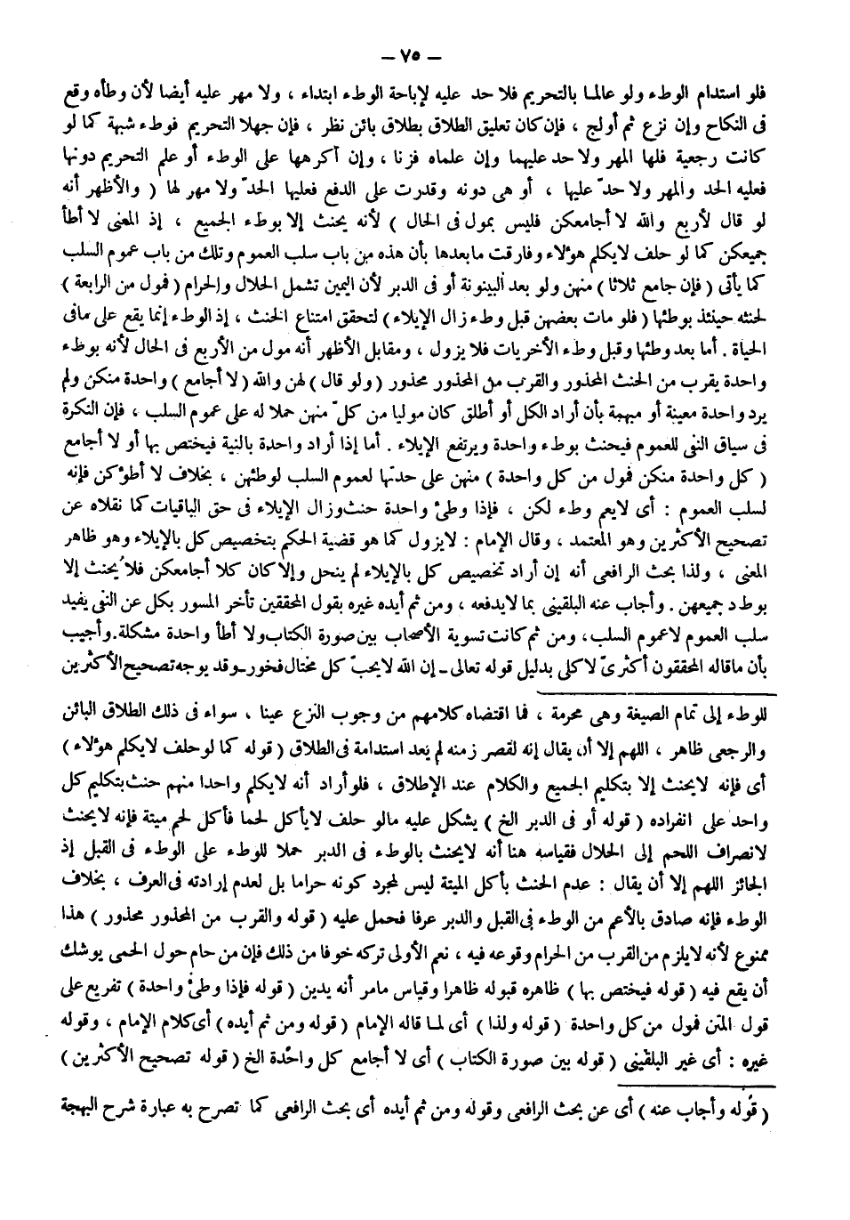 (قَوْلُهُ: كَمَا لَوْ حَلَفَ لَا يُكَلِّمُ هَؤُلَاءِ) أَيْ فَإِنَّهُ لَا يَحْنَثُ إلَّا بِتَكْلِيمِ الْجَمِيعِ، وَالْكَلَامُ عِنْدَ الْإِطْلَاقِ، فَلَوْ أَرَادَ أَنَّهُ لَا يُكَلِّمُ وَاحِدًا مِنْهُمْ حَنِثَ بِتَكْلِيمِ كُلِّ وَاحِدٍ عَلَى انْفِرَادِهِ (قَوْلُهُ أَوْ فِي الدُّبْرِ إلَخْ) يُشْكِلُ عَلَيْهِ مَا لَوْ حَلَفَ لَا يَأْكُلُ لَحْمًا فَأَكَلَ لَحْمَ مَيْتَةٍ فَإِنَّهُ لَا يَحْنَثُ لِانْصِرَافِ اللَّحْمِ إلَى الْحَلَالِ فَقِيَاسُهُ هُنَا أَنَّهُ لَا يَحْنَثُ بِالْوَطْءِ فِي الدُّبْرِ حَمْلًا لِلْوَطْءِ عَلَى الْوَطْءِ فِي الْقُبُلِ إذْ هُوَ الْجَائِزُ اللَّهُمَّ إلَّا أَنْ يُقَالَ: عَدَمُ الْحِنْثِ بِأَكْلِ الْمَيْتَةِ لَيْسَ لِمُجَرَّدِ كَوْنِهِ حَرَامًا بَلْ لِعَدَمِ إرَادَتِهِ فِي الْعُرْفِ، بِخِلَافِ الْوَطْءِ فَإِنَّهُ صَادِقٌ بِالْأَعَمِّ مِنْ الْوَطْءِ فِي الْقُبُلِ وَالدُّبْرِ عُرْفًا فَحُمِلَ عَلَيْهِ (قَوْلُهُ وَالْقُرْبُ مِنْ الْمَحْذُورِ مَحْذُورٌ) هَذَا مَمْنُوعٌ لِأَنَّهُ لَا يَلْزَمُ مِنْ الْقُرْبِ مِنْ الْحَرَامِ وُقُوعُهُ فِيهِ، نَعَمْ الْأَوْلَى تَرْكُهُ خَوْفًا مِنْ ذَلِكَ فَإِنَّ مَنْ حَامَ حَوْلَ الْحِمَى يُوشِكُ أَنْ يَقَعَ فِيهِ.