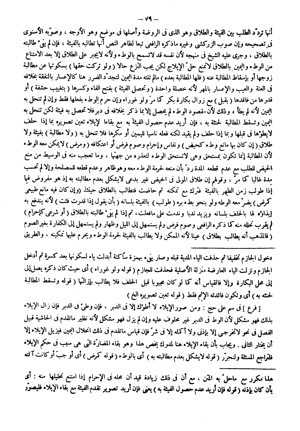 (وَلَا مُطَالَبَةَ) بِفَيْئَةٍ وَلَا طَلَاقٍ (إنْ كَانَ بِهَا مَانِعُ وَطْءٍ كَحَيْضٍ) وَنِفَاسٍ وَإِحْرَامٍ وَصَوْمِ فَرْضٍ أَوْ اعْتِكَافِهِ (وَمَرَضٍ) لَا يُمْكِنُ مَعَهُ الْوَطْءُ لِأَنَّ الْمُطَالَبَةَ إنَّمَا تَكُونُ بِمُسْتَحَقٍّ وَهِيَ لَا تَسْتَحِقُّ الْوَطْءَ لِتَعَذُّرِهِ مِنْ جِهَتِهَا، وَمَا تَعَجَّبَ مِنْهُ فِي الْوَسِيطِ مِنْ مَنْعِ الْحَيْضِ لِلطَّلَبِ مَعَ عَدَمِ قَطْعِهِ الْمُدَّةَ رُدَّ بِأَنَّ مَنْعَهُ لِحُرْمَةِ الْوَطْءِ مَعَهُ وَهُوَ ظَاهِرٌ وَعَدَمُ قَطْعِهِ لِلْمَصْلَحَةِ وَإِلَّا لَمْ تُحْسَبْ مُدَّةٌ غَالِبًا كَمَا مَرَّ، وَقَوْلُهُمْ إنَّ طَلَاقَ الْمُولِي فِي الْحَيْضِ غَيْرُ بِدْعِيٍّ لَا يُشْكِلُ بِعَدَمِ مُطَالَبَتِهِ بِهِ إذْ هُوَ مَفْرُوضٌ فِيمَا إذَا طُولِبَ زَمَنَ الطُّهْرِ بِالْفَيْئَةِ فَتَرَكَ مَعَ تَمَكُّنِهِ ثُمَّ حَاضَتْ فَتُطَالِبُ بِالطَّلَاقِ حِينَئِذٍ.