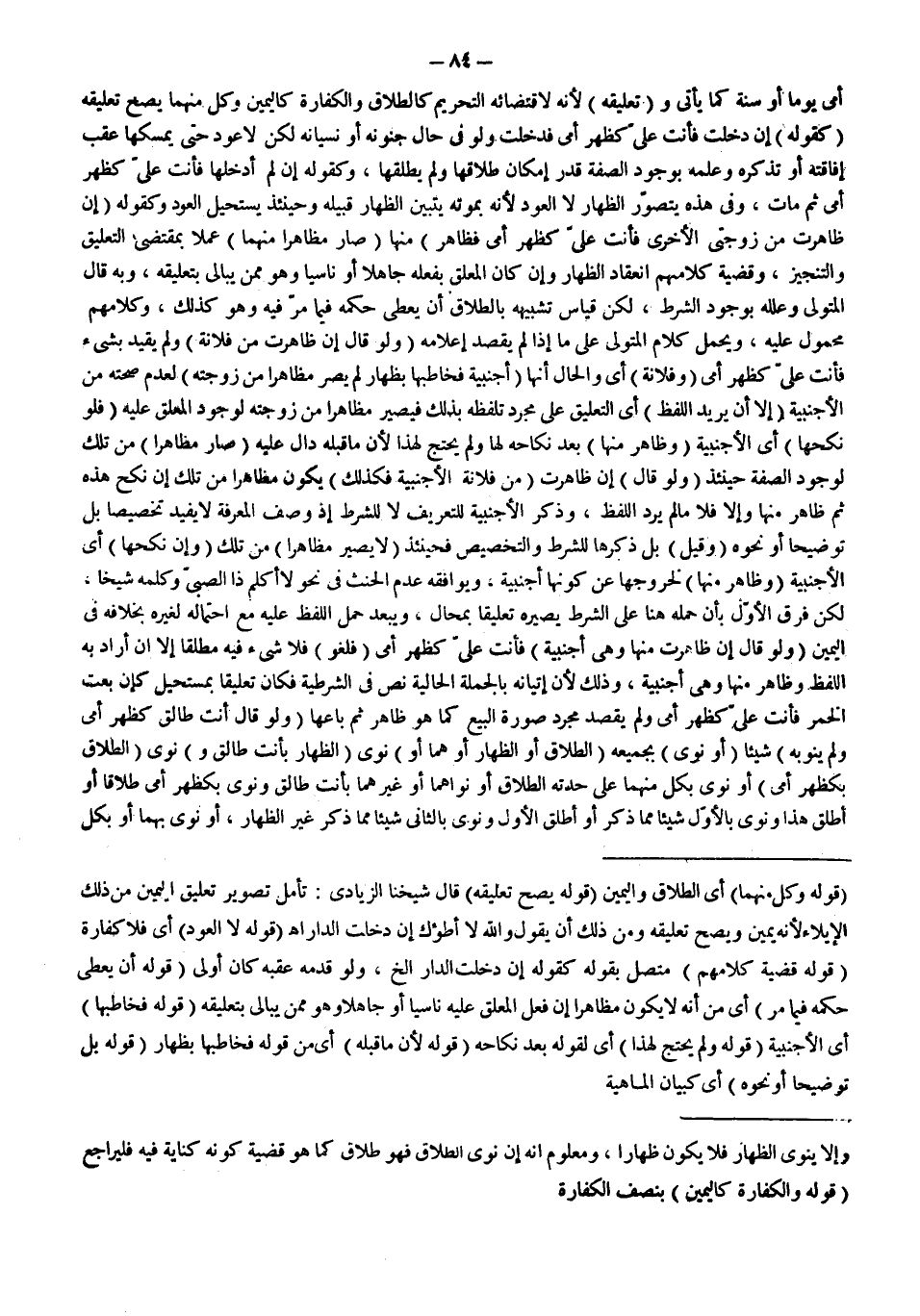 ـــــــــــــــــــــــــــــSقَوْلُهُ: وَكُلٌّ مِنْهُمَا) أَيْ الطَّلَاقُ وَالْيَمِينُ (قَوْلُهُ يَصِحُّ تَعْلِيقُهُ) قَالَ شَيْخُنَا الزِّيَادِيُّ: تَأَمَّلْ تَصْوِيرَ تَعْلِيقِ الْيَمِينِ مِنْ ذَلِكَ الْإِيلَاءِ لِأَنَّهُ يَمِينٌ وَيَصِحُّ تَعْلِيقُهُ وَمِنْ ذَلِكَ أَنْ يَقُولَ وَاَللَّهِ لَا أَطَؤُك إنْ دَخَلْتِ الدَّارَ اهـ (قَوْلُهُ لَا الْعَوْدُ) أَيْ فَلَا كَفَّارَةَ (قَوْلُهُ: قَضِيَّةُ كَلَامِهِمْ) مُتَّصِلٌ بِقَوْلِهِ كَقَوْلِهِ إنْ دَخَلْت الدَّارَ إلَخْ، وَلَوْ قَدَّمَهُ عَقِبَهُ كَانَ أَوْلَى (قَوْلُهُ: أَنْ يُعْطَى حُكْمَهُ فِيمَا مَرَّ) أَيْ مِنْ أَنَّهُ لَا يَكُونُ مُظَاهِرًا إنْ فَعَلَ الْمُعَلَّقَ عَلَيْهِ نَاسِيًا أَوْ جَاهِلًا وَهُوَ مِمَّنْ يُبَالَى بِتَعْلِيقِهِ.