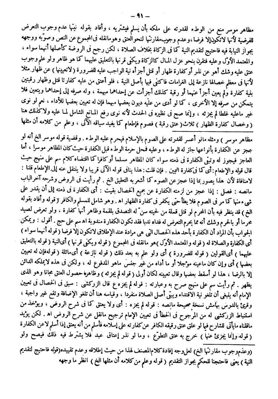 مُظَاهِرٌ مُوسِرٌ مُنِعَ مِنْ الْوَطْءِ لِقُدْرَتِهِ عَلَى مِلْكِهِ بِأَنْ يُسْلِمَ فَيَشْتَرِيَهُ، وَأَفَادَ بِقَوْلِهِ نِيَّتُهَا عَدَمَ وُجُوبِ التَّعَرُّضِ لِلْفَرْضِيَّةِ لِأَنَّهَا لَا تَكُونُ إلَّا فَرْضًا، وَعَدَمُ وُجُوبِ مُقَارَنَتِهَا لِنَحْوِ الْعِتْقِ وَهُوَ مَا نَقَلَهُ فِي الْمَجْمُوعِ عَنْ النَّصِّ وَصَوَّبَهُ وَوَجَّهَهُ بِجَوَازِ النِّيَابَةِ فِيهِ فَاحْتِيجَ لِتَقْدِيمِ النِّيَّةِ كَمَا فِي الزَّكَاةِ بِخِلَافِ الصَّلَاةِ، لَكِنْ رَجَّحَ فِي الرَّوْضَةِ كَأَصْلِهَا أَنَّهُمَا سَوَاءٌ، وَالْمُعْتَمَدُ الْأَوَّلُ وَعَلَيْهِ فَتُقْرَنُ بِنَحْوِ عَزْلِ الْمَالِ كَالزَّكَاةِ وَيَكْفِي قَرْنُهَا بِالتَّعْلِيقِ عَلَيْهِمَا كَمَا هُوَ ظَاهِرٌ وَلَوْ عَلِمَ وُجُوبَ عِتْقٍ عَلَيْهِ وَشَكَّ أَهُوَ عَنْ نَذْرٍ أَوْ كَفَّارَةِ ظِهَارٍ أَوْ قَتْلٍ أَجْزَأَهُ نِيَّةُ الْوَاجِبِ عَلَيْهِ لِلضَّرُورَةِ (لَا تَعْيِينُهَا) عَنْ ظِهَارٍ مَثَلًا لِأَنَّهَا فِي مُعْظَمِ خِصَالِهَا نَازِعَةٌ إلَى الْغَرَامَاتِ فَاكْتُفِيَ فِيهَا بِأَصْلِ النِّيَّةِ، فَلَوْ أَعْتَقَ مَنْ عَلَيْهِ كَفَّارَتَا قَتْلٍ وَظِهَارٍ رَقَبَتَيْنِ بِنِيَّةِ كَفَّارَةٍ وَلَمْ يُعَيِّنْ أَجْزَأَ عَنْهُمَا أَوْ رَقَبَةً كَذَلِكَ أَجْزَأَتْ عَنْ إحْدَاهُمَا مُبْهَمَةً، وَلَهُ صَرْفُهُ إلَى إحْدَاهُمَا وَيَتَعَيَّنُ فَلَا يَتَمَكَّنُ مِنْ صَرْفِهِ إلَّا الْأُخْرَى، كَمَا لَوْ أَدَّى مَنْ عَلَيْهِ دُيُونٌ بَعْضَهَا مُبْهِمًا فَإِنْ لَهُ تَعْيِينَ بَعْضِهَا لِلْأَدَاءِ، نَعَمْ لَوْ نَوَى غَيْرَ مَا عَلَيْهِ غَلَطًا لَمْ يُجْزِئْهُ، وَإِنَّمَا صَحَّ فِي نَظِيرِهِ فِي الْحَدَثِ لِأَنَّهُ نَوَى رَفْعَ الْمَانِعِ الشَّامِلِ لِمَا عَلَيْهِ وَلَا كَذَلِكَ هُنَا.