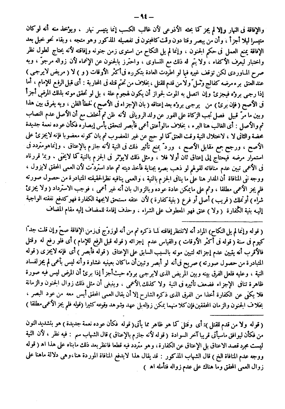 وَيُؤْخَذُ مِنْهُ أَنَّهُ لَوْ كَانَ مُتَيَسِّرًا لَيْلًا أَجْزَأَ، وَأَنَّ مَنْ يُبْصِرُ وَقْتًا دُونَ وَقْتٍ كَالْمَجْنُونِ فِي تَفْصِيلِهِ الْمَذْكُورِ وَهُوَ مُتَّجَهٌ، وَبَقَاءُ نَحْوِ خَبَلٍ بَعْدَ الْإِفَاقَةِ يَمْنَعُ الْعَمَلَ فِي حُكْمِ الْجُنُونِ، وَإِنَّمَا لَمْ يَلِ النِّكَاحَ مَنْ اسْتَوَى زَمَنُ جُنُونِهِ وَإِفَاقَتِهِ لِأَنَّهُ يَحْتَاجُ لِطُولِ نَظَرٍ وَاخْتِبَارٍ لَيَعْرِفَ الْأَكْفَاءَ، وَلَا يَتِمُّ لَهُ ذَلِكَ مَعَ التَّسَاوِي، وَاحْتُرِزَ بِالْجُنُونِ عَنْ الْإِغْمَاءِ لِأَنَّ زَوَالَهُ مَرْجُوٌّ، وَبِهِ صَرَّحَ الْمَاوَرْدِيُّ لَكِنْ تَوَقَّفَ غَيْرُهُ فِيمَا لَوْ اطَّرَدَتْ الْعَادَةُ بِتَكَرُّرِهِ فِي أَكْثَرِ الْأَوْقَاتِ (وَ) لَا (مَرِيضٌ لَا يُرْجَى) عِنْدَ الْعِتْقِ بُرْءُ مَرَضِهِ كَفَالِجٍ وَسُلٍّ وَلَا مَنْ قُدِّمَ لِلْقَتْلِ، بِخِلَافِ مَنْ تَحَتَّمَ قَتْلُهُ فِي الْمُحَارَبَةِ: أَيْ قَبْلَ الرَّفْعِ لِلْإِمَامِ، أَمَّا إذَا رُجِيَ بُرْؤُهُ فَيُجْزِئُ وَإِنْ اتَّصَلَ بِهِ الْمَوْتُ لِجَوَازِ أَنْ يَكُونَ لِهُجُومِ عِلَّةٍ، بَلْ لَوْ تَحَقَّقَ مَوْتُهُ بِذَلِكَ الْمَرَضِ أَجْزَأَ فِي الْأَصَحِّ.