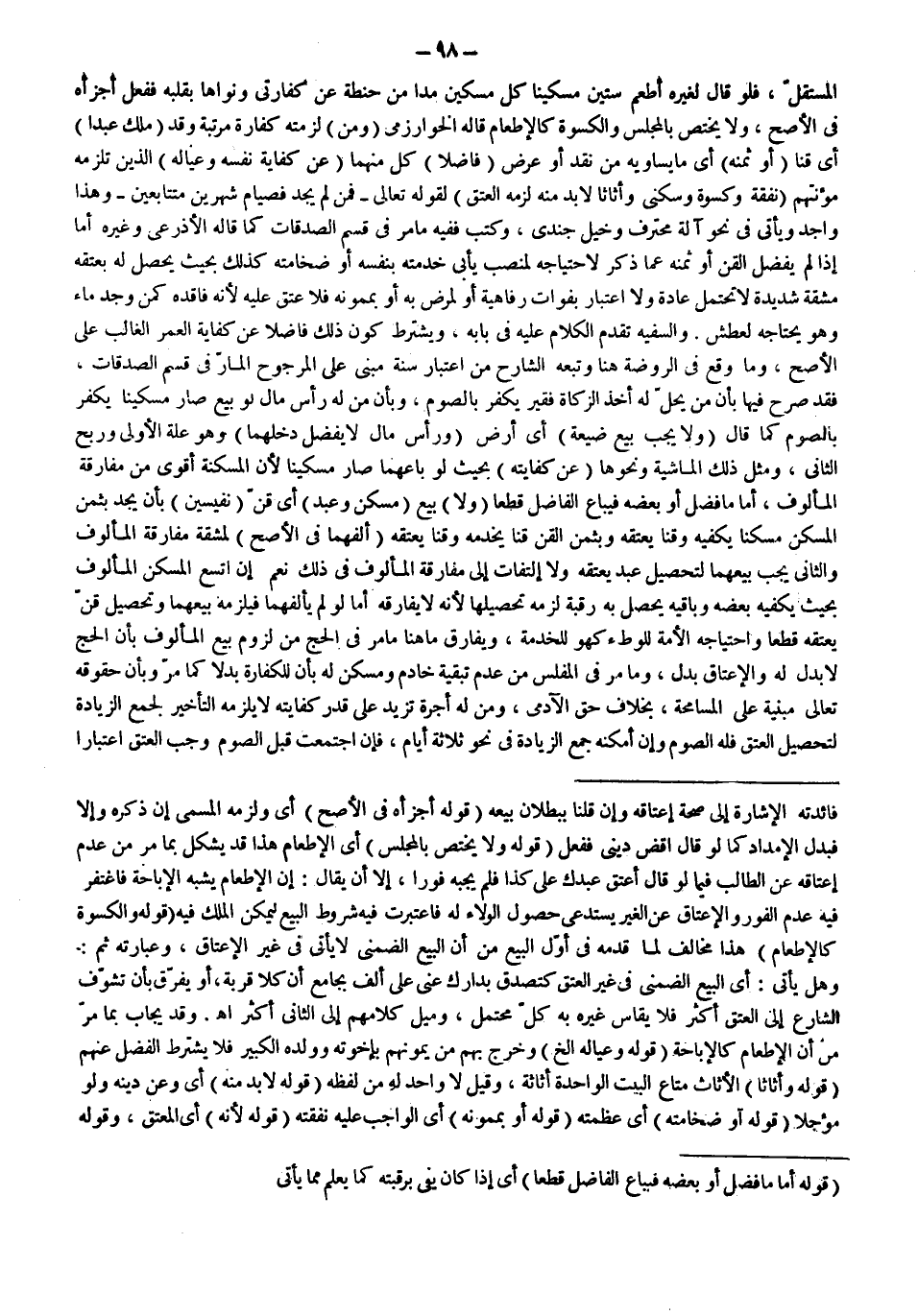 (وَمَنْ) لَزِمَتْهُ كَفَّارَةٌ مُرَتَّبَةٌ وَقَدْ (مَلَكَ عَبْدًا) أَيْ قِنًّا (أَوْ ثَمَنَهُ) أَيْ مَا يُسَاوِيهِ مِنْ نَقْدٍ أَوْ عَرْضٍ (فَاضِلًا) كُلٌّ مِنْهُمَا (عَنْ كِفَايَةِ نَفْسِهِ وَعِيَالِهِ) الَّذِينَ تَلْزَمُهُ مُؤْنَتُهُمْ (نَفَقَةً وَكِسْوَةً وَسُكْنَى وَأَثَاثًا لَا بُدَّ مِنْهُ) (لَزِمَهُ الْعِتْقُ) لِقَوْلِهِ تَعَالَى {فَمَنْ لَمْ يَجِدْ فَصِيَامُ شَهْرَيْنِ مُتَتَابِعَيْنِ} [المجادلة: 4] وَهَذَا وَاجِدٌ وَيَأْتِي فِي نَحْوِ آلَةِ مُحْتَرِفٍ وَخَيْلِ جُنْدِيٍّ، وَكُتُبِ فَقِيهٍ مَا مَرَّ فِي قَسْمِ الصَّدَقَاتِ كَمَا قَالَهُ الْأَذْرَعِيُّ وَغَيْرُهُ أَمَّا إذَا لَمْ يَفْضُلْ الْقِنُّ أَوْ ثَمَنُهُ عَمَّا ذَكَرَ لِاحْتِيَاجِهِ لِمَنْصِبٍ يَأْبَى خِدْمَتَهُ بِنَفْسِهِ أَوْ ضَخَامَتِهِ كَذَلِكَ بِحَيْثُ يَحْصُلُ لَهُ بِعِتْقِهِ مَشَقَّةٌ شَدِيدَةٌ لَا تُحْتَمَلُ عَادَةً وَلَا اعْتِبَارَ بِفَوَاتِ رَفَاهِيَةٍ أَوْ لِمَرَضٍ بِهِ أَوْ بِمُمَوِّنِهِ فَلَا عِتْقَ عَلَيْهِ لِأَنَّهُ فَاقِدُهُ كَمَنْ وَجَدَ مَاءً وَهُوَ يَحْتَاجُهُ لِعَطَشٍ. وَالسَّفِيهُ تَقَدَّمَ الْكَلَامُ عَلَيْهِ فِي بَابِهِ، وَيُشْتَرَطُ كَوْنُ ذَلِكَ فَاضِلًا عَنْ كِفَايَةِ الْعُمْرِ الْغَالِبِ عَلَى الْأَصَحِّ، وَمَا وَقَعَ فِي الرَّوْضَةِ هُنَا وَتَبِعَهُ الشَّارِحُ مِنْ اعْتِبَارِ سَنَةٍ مَبْنِيٌّ عَلَى الْمَرْجُوحِ الْمَارِّ فِي قَسْمِ الصَّدَقَاتِ، فَقَدْ صَرَّحَ فِيهَا بِأَنَّ مَنْ يَحِلُّ لَهُ أَخْذُ الزَّكَاةِ فَقِيرٌ يُكَفِّرُ بِالصَّوْمِ، وَبِأَنَّ مَنْ لَهُ رَأْسُ مَالٍ لَوْ بِيعَ صَارَ مِسْكِينًا يُكَفِّرُ بِالصَّوْمِ.