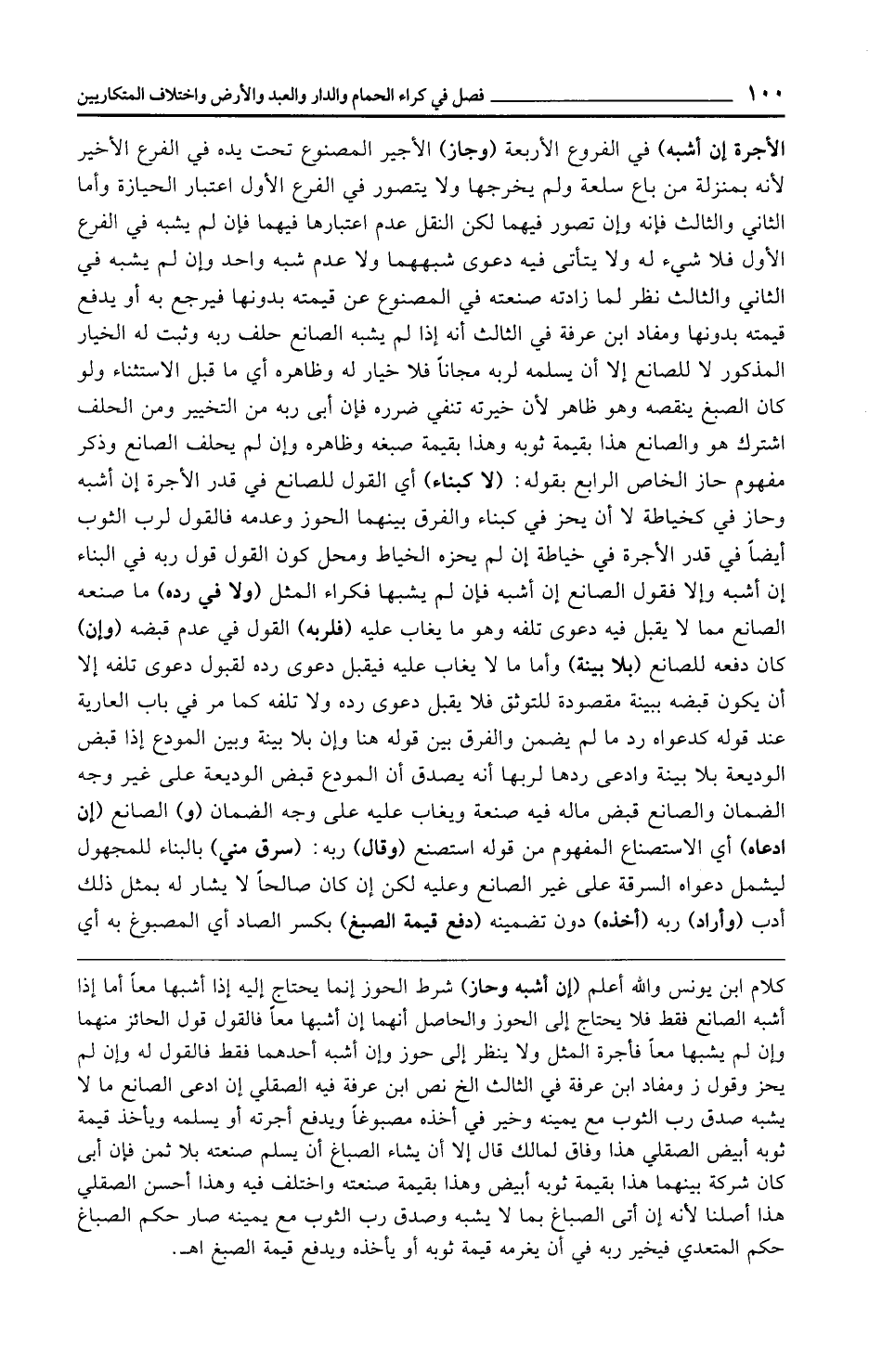 كلام ابن يونس والله أعلم (إن أشبه وحاز) شرط الحوز إنما يحتاج إليه إذا أشبها معًا أما إذا أشبه الصانع فقط فلا يحتاج إلى الحوز والحاصل أنهما إن أشبها معًا فالقول قول الحائز منهما وإن لم يشبها معًا فأجرة المثل ولا ينظر إلى حوز وإن أشبه أحدهما فقط فالقول له وإن لم يحز وقول ز ومفاد ابن عرفة في الثالث الخ نص ابن عرفة فيه الصقلي إن ادعى الصانع ما لا يشبه صدق رب الثوب مع يمينه وخير في أخذه مصبوغًا ويدفع أجرته أو يسلمه ويأخذ قيمة ثوبه أبيض الصقلي هذا وفاق لمالك قال إلا أن يشاء الصباغ أن يسلم صنعته بلا ثمن فإن أبى كان شركة بينهما هذا بقيمة ثوبه أبيض وهذا بقيمة صنعته واختلف فيه وهذا أحسن الصقلي هذا أصلنا لأنه إن أتى الصباغ بما لا يشبه وصدق رب الثوب مع يمينه صار حكم الصباغ حكم المتعدي فيخير ربه في أن يغرمه قيمة ثوبه أو يأخذه ويدفع قيمة الصبغ اهـ.