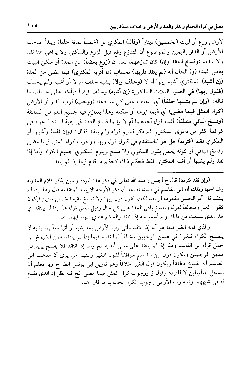 لأرض زرع أو لبيت (بخمسين) دينارًا (وقال) المكري بل (خمسًا بمائة حلفا) ويبدأ صاحب الأرض أو الدار باليمين والموضوع أن التنازع وقع قبل الزرع والسكنى ولا يراعى هنا نقد ولا عدمه (وفسخ العقد وإن) كان تنازعهما بعد أن (زرع بعضًا) من المدة أو سكن البيت بعض المدة (و) الحال أنه (لم ينقد فلربها) بحساب (ما أقربه المكتري) فيما مضى من المدة (إن أشبه) المكتري أشبه ربها أم لا (وحلف وإلا) يشبه حلف أم لا أو أشبه ولم يحلف (فقول ربها) في الصور الثلاث المذكورة (إن أشبه) وحلف أيضًا فيأخذ على حساب ما قاله: (وإن لم يشبها حلفًا) أي يحلف على كل ما ادعاه (ووجب) لرب الدار أو الأرض (كراء المثل فيما مضى) أي فيما زرعه أو سكنه وهذا يتنازع فيه جميع العوامل السابقة (وفسخ الباقي مطلقًا) أشبه قول أحدهما أم لا وإنما فسخ العقد في بقية المدة لدعواه في كرائها أكثر من دعوى المكتري ثم ذكر قسيم قوله ولم ينقد فقال: (وإن نقد) وأشبها أو المكري فقط (فتردد) هل هو كالمتقدم في قبول قول ربها ووجوب كراء المثل فيما مضى وفسخ الباقي أو كونه يعمل بقول المكري ولا فسخ ويلزم المكتري جميع الكراء وأما إذا نقد ولم يشبها أو أشبه المكتري فقط فحكم ذلك كحكم ما قدم فيما إذا لم ينقد.