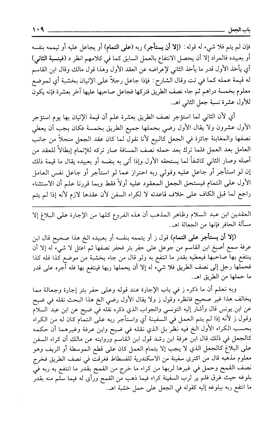 وبه تعلم أن ما ذكره ز في باب الإجارة عند قوله وعلى حفر بئر إجارة وجعالة مما يخالف هذا غير صحيح فانظره وقول ز ولا يقال الأول رضي الخ هذا البحث نقله في ضيح عن ابن يونس قال وأشار إليه التونسي والجواب الذي ذكره نقله في ضيح عن ابن عبد السلام وقول ز لأنه إذا لم يتم العمل في السفينة أي واستأجر ربه على التمام كان له من الكراء بحسب الكراء الأول الخ فيه نظر بل الذي نقله في ضيح وابن عرفة وغيرهما أن حكمه كالجعل في ذلك قال ابن عرفة ابن رشد قول ابن القاسم وروايته عن مالك أن كراء السفن على البلاغ كالجعل الذي لا يجب إلا بتمام العمل كان على قطع الموسطة أو الريف وهو معلوم مذهبه قال من اكترى سفينة من الأسكندرية للفسطاط فغرقت في نصف الطريق فخرج نصف القمح وحمل في غيرها لربها من كراء ما خرج من القمح بقدر ما انتفع به ربه في بلوغه حيث غرق فلم ير لرب السفينة كراء فيما ذهب من القمح ورأى له فيما سلم منه بقدر ما انتفع ربه ببلوغه إليه كقوله في الجعل على حمل خشبة اهـ.