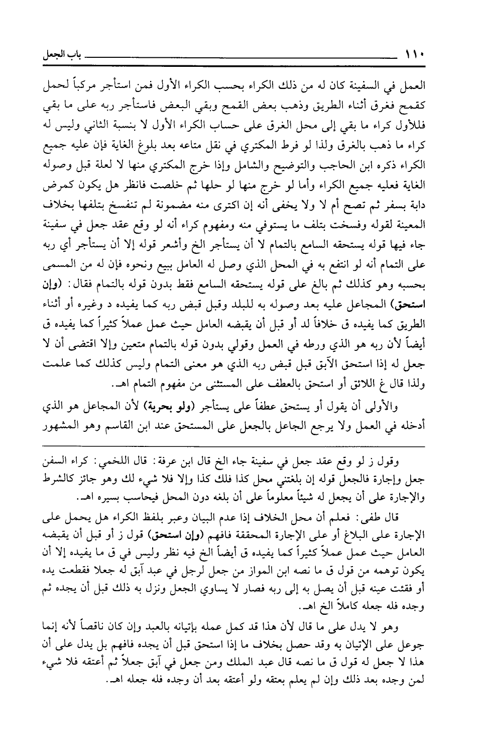 وقول ز لو وقع عقد جعل في سفينة جاء الخ قال ابن عرفة: قال اللخمي: كراء السفن جعل وإجارة فالجعل قوله إن بلغتني محل كذا ذلك كذا وإلا فلا شيء لك وهو جائز كالشرط والإجارة على أن يجعل له شيئًا معلومًا على أن بلغه دون المحل فيحاسب بسيره اهـ.