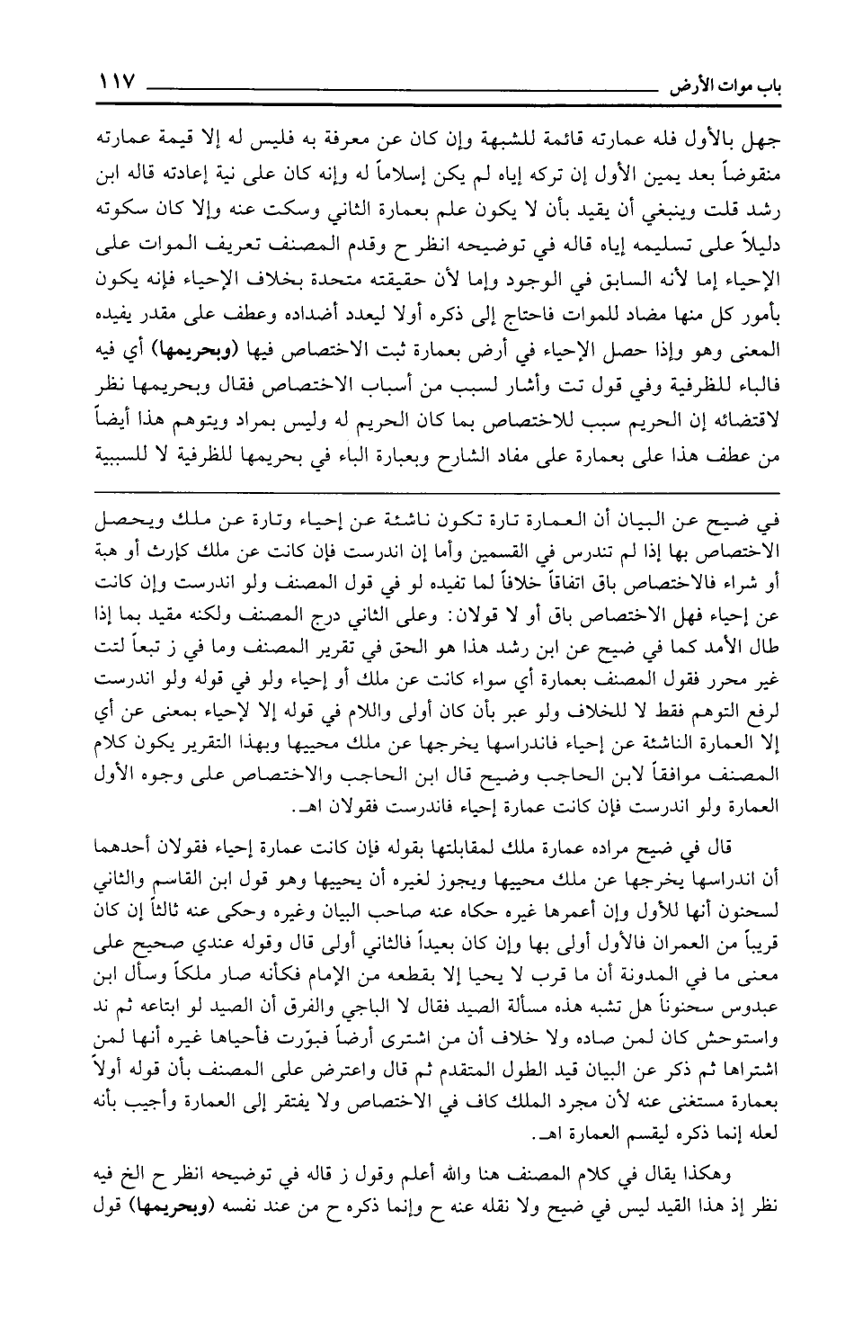 جهل بالأول فله عمارته قائمة للشبهة وإن كان عن معرفة به فليس له إلا قيمة عمارته منقوضًا بعد يمين الأول إن تركه إياه لم يكن إسلامًا له وإنه كان على نية إعادته قاله اين رشد قلت وينبغي أن يقيد بأن لا يكون علم بعمارة الثاني وسكت عنه وإلا كان سكوته دليلًا على تسليمه إياه قاله في توضيحه انظر ح وقدم المصنف تعريف الموات على الإحياء إما لأنه السابق في الوجود وإما لأن حقيقته متحدة بخلاف الإحياء فإنه يكون بأمور كل منها مضاد للموات فاحتاج إلى ذكره أولًا ليعدد أضداده وعطف على مقدر يفيده المعنى وهو وإذا حصل الإحياء في أرض بعمارة ثبت الاختصاص فيها (وبحريمها) أي فيه فالباء للظرفية وفي قول تت وأشار لسبب من أسباب الاختصاص فقال وبحريمها نظر لاقتضائه إن الحريم سبب للاختصاص بما كان الحريم له وليس بمراد ويتوهم هذا أيضًا من عطف هذا على بعمارة على مفاد الشارح وبعبارة الباء في بحريمها للظرفية لا للسببية