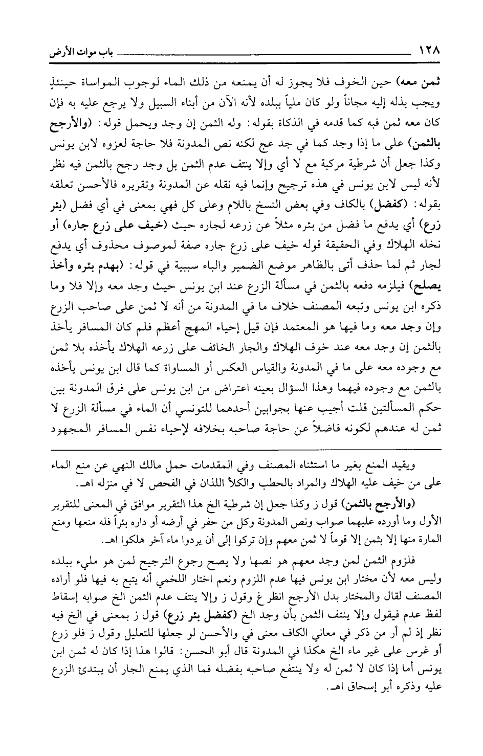 (والأرجح بالثمن) قول ز وكذا جعل إن شرطية الخ هذا التقرير موافق في المعنى للتقرير الأول وما أورده عليهما صواب ونص المدونة وكل من حفر في أرضه أو داره بئرًا فله منعها ومنع المارة منها إلا بثمن إلا قومًا لا ثمن معهم وإن تركوا إلى أن يردوا ماء آخر هلكوا اهـ.