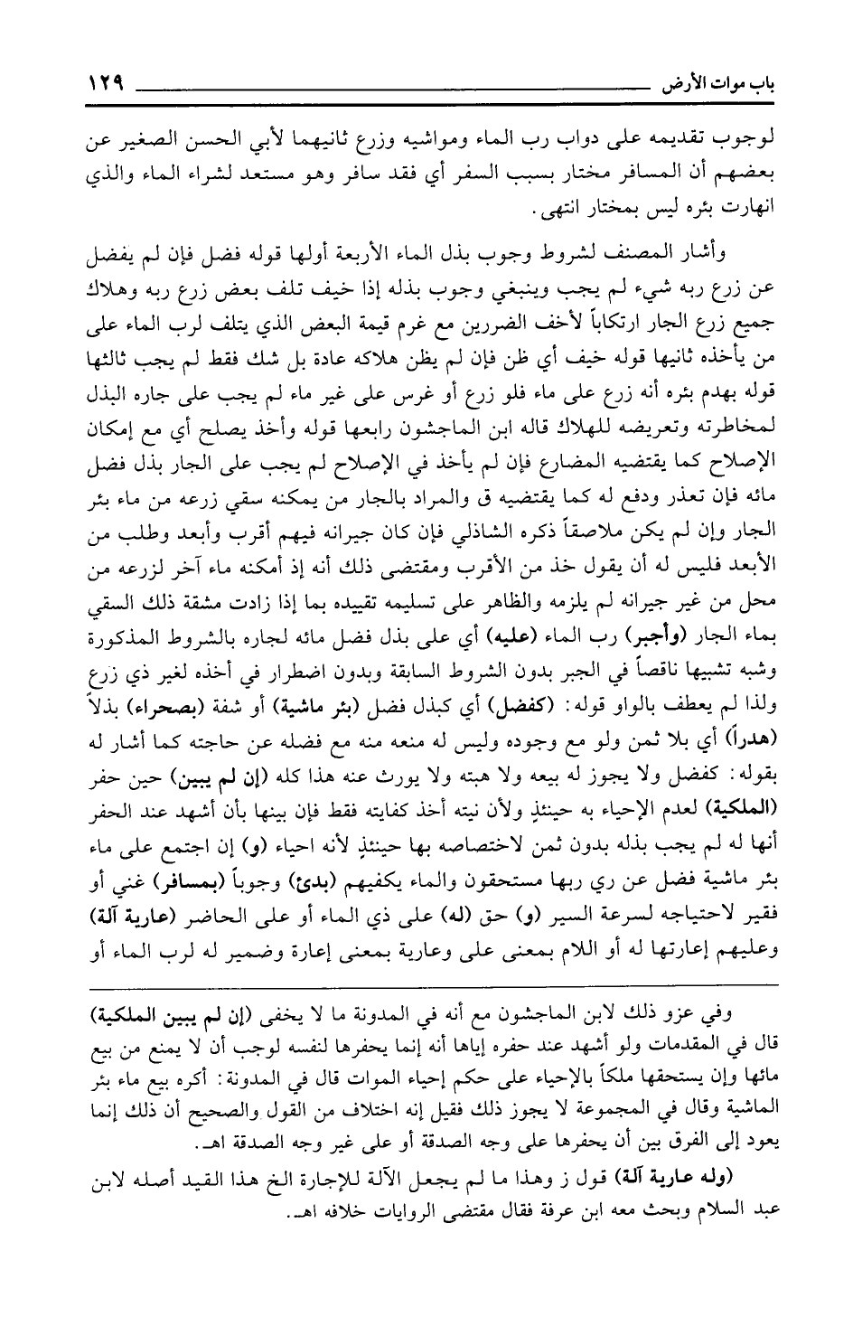 وأشار المصنف لشروط وجوب بذل الماء الأربعة أولها قوله فضل فإن لم يفضل عن زرع ربه شيء لم يجب وينبغي وجوب بذله إذا خيف تلف بعض زرع ربه وهلاك جميع زرع الجار ارتكابًا لأخف الضررين مع غرم قيمة البعض الذي يتلف لرب الماء على من يأخذه ثانيها قوله خيف أي ظن فإن لم يظن هلاكه عادة بل شك فقط لم يجب ثالثها قوله بهدم بئره أنه زرع على ماء فلو زرع أو غرس على غير ماء لم يجب على جاره البذل لمخاطرته وتعريضه للهلاك قاله ابن الماجشون رابعها قوله وأخذ يصلح أي مع إمكان الإصلاح كما يقتضيه المضارع فإن لم يأخذ في الإصلاح لم يجب على الجار بذل فضل مائه فإن تعذر ودفع له كما يقتضيه ق والمراد بالجار من يمكنه سقي زرعه من ماء بئر الجار وإن لم يكن ملاصقًا ذكره الشاذلي فإن كان جيرانه فيهم أقرب وأبعد وطلب من الأبعد فليس له أن يقول خذ من الأقرب ومقتضى ذلك أنه إذ أمكنه ماء آخر لزرعه من محل من غير جيرانه لم يلزمه والظاهر على تسليمه تقييده بما إذا زادت مشقة ذلك السقي بماء الجار (وأجبر) رب الماء (عليه) أي على بذل فضل مائه لجاره بالشروط المذكورة وشبه تشبيها ناقصًا في الجبر بدون الشروط السابقة وبدون اضطرار في أخذه لغير ذي زرع ولذا لم يعطف بالواو قوله: (كفضل) أي كبذل فضل (بئر ماشية) أو شفة (بصحراء) بذلًا (هدرًا) أي بلا ثمن ولو مع وجوده وليس له منعه منه مع فضله عن حاجته كما أشار له بقوله: كفضل ولا يجوز له بيعه ولا هبته ولا يورث عنه هذا كله (إن لم يبين) حين حفر (الملكية) لعدم الإحياء به حينئذٍ ولأن نيته أخذ كفايته فقط فإن بينها بأن أشهد عند الحفر أنها له لم يجب بذله بدون ثمن لاختصاصه بها حينئذ لأنه إحياء (و) إن اجتمع على ماء بئر ماشية فضل عن ري ربها مستحقون والماء يكفيهم (بدئ) وجوبًا (بمسافر) غني أو فقير لاحتياجه لسرعة السير (و) حق (له) على ذي الماء أو على الحاضر (عارية آلة) وعليهم إعارتها له أو اللام بمعنى على وعارية بمعنى إعارة وضمير له لرب الماء أو