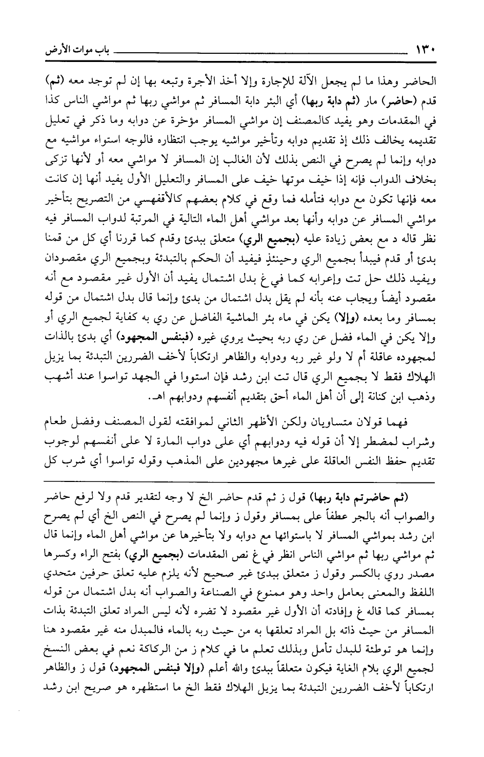 (ثم حاضرتم دابة ربها) قول ز ثم قدم حاضر الخ لا وجه لتقدير قدم ولا لرفع حاضر والصواب أنه بالجر عطفًا على بمسافر وقول ز وإنما لم يصرح في النص الخ أي لم يصرح ابن رشد بمواشي المسافر لا باستوائها مع دوابه ولا بتأخيرها عن مواشي أهل الماء وإنما قال ثم مواشي ربها ثم مواشي الناس انظر في غ نص المقدمات (بجميع الري) بفتح الراء وكسرها مصدر روي بالكسر وقول ز متعلق ببدئ غير صحيح لأنه يلزم عليه تعلق حرفين متحدي اللفظ والمعنى بعامل واحد وهو ممنوع في الصناعة والصواب أنه بدل اشتمال من قوله بمسافر كما قاله غ وإفادته أن الأول غير مقصود لا تضره لأنه ليس المراد تعلق التبدئة بذات المسافر من حيث ذاته بل المراد تعلقها به من حيث ربه بالماء فالمبدل منه غير مقصود هنا وإنما هو توطئة للبدل تأمل وبذلك تعلم ما في كلام ز من الركاكة نعم في بعض النسخ لجميع الري بلام الغاية فيكون متعلقًا ببدئ والله أعلم (وإلا فبنفس المجهود) قول ز والظاهر ارتكابًا لأخف الضررين التبدئة بما يزيل الهلاك فقط الخ ما استظهره هو صريح ابن رشد