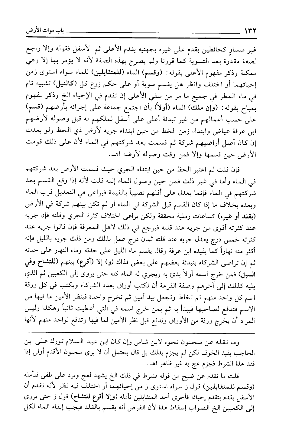قلت ما تقدم عن ضيح من قوله فشرط في ذلك الخ يشهد لعج ويرد على طفى فتأمله (وقسم للمتقابلين) قول ز سواء استوى ز من إحيائهما أو اختلف فيه نظر لأنه تقدم أن الأسفل يقدم بتقدم إحيائه فأحرى أحد المتقابلين تأمله (وإلا أقرع للتشاح) قول ز حتى يروى إلى الكعبين الخ الصواب إسقاط هذا لأن الفرض أنه يقسم بالقلد فيجب إبقاء الماء لكل