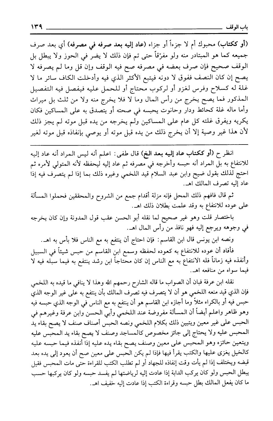 (أو ككتاب) محبوك أم لا جزءًا أو جزاء (عاد إليه بعد صرفه في مصرفه) أي بعد صرف جميعه كما هو المبتادر منه ولو مفرّقًا حتى تم فإن ذلك لا يضر في الحوز ولا يبطل بل الوقف صحيح فإن صرف بعضه في مصرفه صح فيه الوقف وإن قل وما لم يصرفه لا يصح إن كان النصف ففوق لا دونه فيتبع الأكثر الذي فيه وأدخلت الكاف سائر ما لا غلة له كسلاح وفرس لغزو أو لركوب محتاج أو للحمل عليه فيفصل فيه التفصيل المذكور فما يصح يخرج من رأس المال وما لا فلا يخرج منه ولا من ثلث بل ميراث وأما ماله غلة كحائط ودار وحانوت يحبسه في صحته أو يتصدق به على المساكين فكان يكريه ويفرق غلته كل عام على المساكين ولم يخرجه من يده قبل موته لم يجز ذلك لأن هذا غير وصية إلا أن يخرج ذلك من يده قبل موته أو يوصي بإنفاذه قبل موته لغير