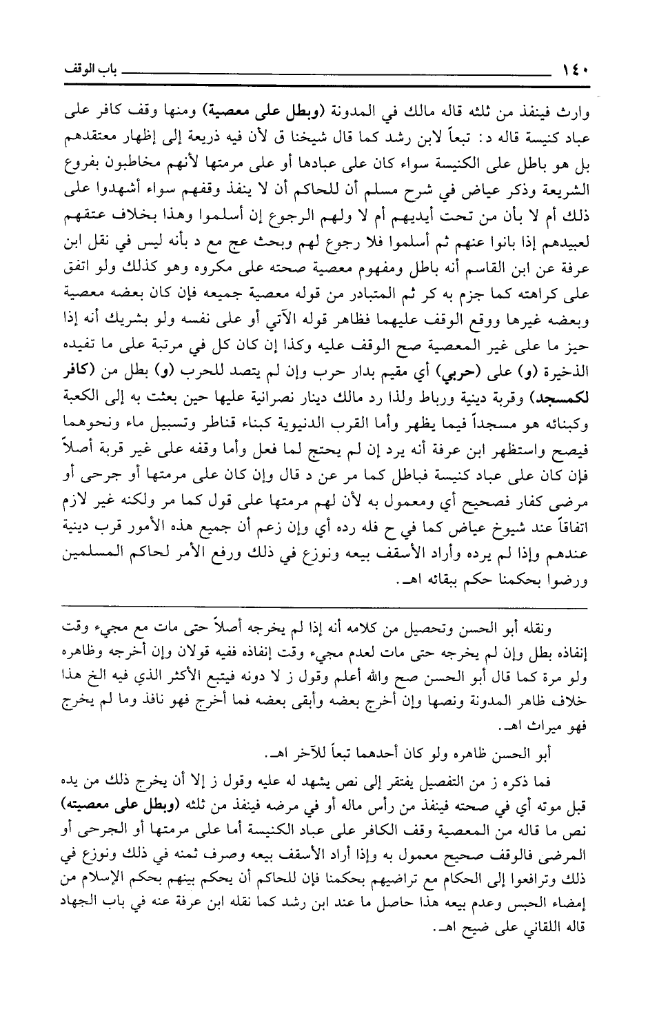 فما ذكره ز من التفصيل يفتقر إلى نص يشهد له عليه وقول ز إلا أن يخرج ذلك من يده قبل موته أي في صحته فينفذ من رأس ماله أو في مرضه فينفذ من ثلثه (وبطل على معصيته) نص ما قاله من المعصية وقف الكافر على عباد الكنيسة أما على مرمتها أو الجرحى أو المرضى فالوقف صحيح معمول به وإذا أراد الأسقف بيعه وصرف ثمنه في ذلك ونوزع في ذلك وترافعوا إلى الحكام مع تراضيهم بحكمنا فإن للحاكم أن يحكم بينهم بحكم الإسلام من إمضاء الحبس وعدم بيعه هذا حاصل ما عند ابن رشد كما نقله ابن عرفة عنه في باب الجهاد قاله اللقاني على ضيح اهـ.