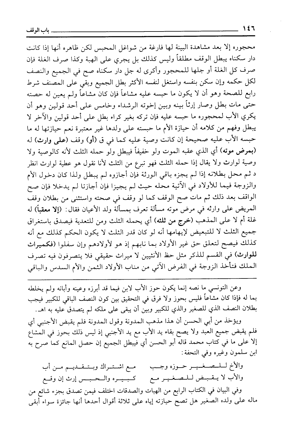 محجوره إلا بعد مشاهدة البينة لها فارغة من شواغل المحبس لكن ظاهره أنها إذا كانت دار سكناه يبطل الوقف مطلقًا وليس كذلك بل يجري على الهبة وكذا صرف الغلة فإن صرف كل الغلة أو جلها للمحجور وأكرى له جل دار سكناه صح في الجميع والنصف لكل حكمه وإن سكن بنفسه واستغل لنفسه الأكثر بطل الجميع وبقي على المصنف شرط رابع للصحة وهو أن لا يكون ما حبسه عليه مشاعًا فإن كان مشاعًا ولم يعين له حصته حتى مات بطل وصار إرثًا بينه وبين إخوته الرشداء وخامس على أحد قولين وهو أن يكري الأب لمحجوره ما حبسه عليه فإن تركه بغير كراء بطل على أحد قولين والآخر لا يبطل وفهم من كلامه أن حيازة الأم ما حبسته على ولدها غير معتبرة نعم حيازتها له ما حبسه الأب عليه صحيحة إن كانت وصية عليه كما في ق (أو) وقف (على وارث) له (بمرض موته) أي الذي عقبه الموت ولو خفيفًا فيبطل ولو حمله الثلث لأنه كالوصية ولا وصية لوارث ولا يقال إذا حمله الثلث فهو تبرع من الثلث لأنا نقول هو عطية لوارث انظر د ثم محل بطلانه إذا لم يجزه باقي الورثة فإن أجازوه لم يبطل ولذا كان دخول الأم والزوجة فيما للأولاد في الآتية محله حيث لم يجيزا فإن أجازتا لم يدخلا فإن صح الواقف بعد ذلك ثم مات صح الوقف كما لو وقف في صحته واستثنى من بطلان وقف المريض على وارثه في مرض موته مسألة تعرف بمسألة ولد الأعيان فقال: (إلا معقبًا) له غلة أم لا على المذهب (خرج من ثلثه) أي يحمله الثلث ومن للتعدية فيصدق باستغراق جميع الثلث لا للتبعيض لإيهامها أنه لو كان قدر الثلث لا يكون الحكم كذلك مع أنه كذلك فيصح لتعلق حق غير الأولاد بما نابهم إذ هو لأولادهم وإن سفلوا (فكميراث للوارث) في القسم للذكر مثل حظ الأنثيين لا ميراث حقيقي فلا يتصرفون فيه تصرف الملك فتأخذ الزوجة في الفرض الآتي من مناب الأولاد الثمن والأم السدس والباقي