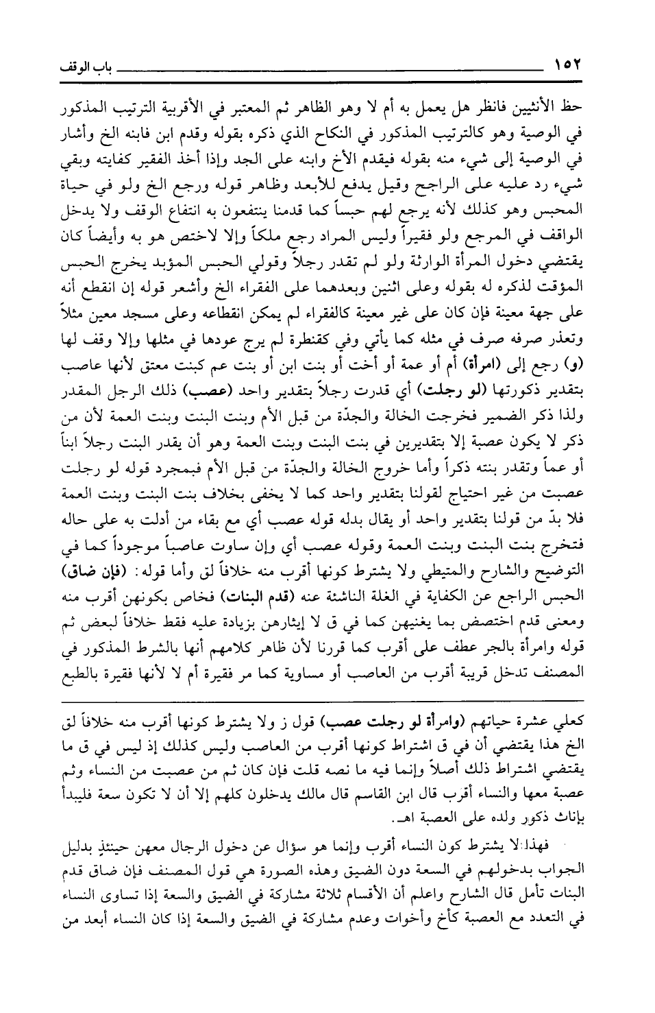حظ الأنثيين فانظر هل يعمل به أم لا وهو الظاهر ثم المعتبر في الأقربية الترتيب المذكور في الوصية وهو كالترتيب المذكور في النكاح الذي ذكره بقوله وقدم ابن فابنه الخ وأشار في الوصية إلى شيء منه بقوله فيقدم الأخ وابنه على الجد وإذا أخذ الفقير كفايته وبقي شيء رد عليه على الراجح وقيل يدفع للأبعد وظاهر قوله ورجع الخ ولو في حياة المحبس وهو كذلك لأنه يرجع لهم حبسًا كما قدمنا ينتفعون به انتفاع الوقف ولا يدخل الواقف في المرجع ولو فقيرًا وليس المراد رجع ملكًا وإلا لاختص هو به وأيضًا كان يقتضي دخول المرأة الوارثة ولو لم تقدر رجلًا وقولي الحبس المؤبد يخرج الحبس المؤقت لذكره له بقوله وعلى اثنين وبعدهما على الفقراء الخ وأشعر قوله إن انقطع أنه على جهة معينة فإن كان على غير معينة كالفقراء لم يمكن انقطاعه وعلى مسجد معين مثلًا وتعذر صرفه صرف في مثله كما يأتي وفي كقنطرة لم يرج عودها في مثلها وإلا وقف لها (و) رجع إلى (امرأة) أم أو عمة أو أخت أو بنت ابن أو بنت عم كبنت معتق لأنها عاصب بتقدير ذكورتها (لو رجلت) أي قدرت رجلًا بتقدير واحد (عصب) ذلك الرجل المقدر ولذا ذكر الضمير فخرجت الخالة والجدّة من قبل الأم وبنت البنت وبنت العمة لأن من ذكر لا يكون عصبة إلا بتقديرين في بنت البنت وبنت العمة وهو أن يقدر البنت رجلًا ابنًا أو عمًّا وتقدر بنته ذكرًا وأما خروج الخالة والجدّة من قبل الأم فبمجرد قوله لو رجلت عصبت من غير احتياج لقولنا بتقدير واحد كما لا يخفى بخلاف بنت البنت وبنت العمة فلا بد من قولنا بتقدير واحد أو يقال بدله قوله عصب أي مع بقاء من أدلت به على حاله فتخرج بنت البنت وبنت العمة وقوله عصب أي وإن ساوت عاصبًا موجودًا كما في التوضيح والشارح والمتيطي ولا يشترط كونها أقرب منه خلافًا لق وأما قوله: (فإن ضاق) الحبس الراجع عن الكفاية في الغلة الناشئة عنه (قدم البنات) فخاص بكونهن أقرب منه ومعنى قدم اختصض بما يغنيهن كما في ق لا إيثارهن بزيادة عليه فقط خلافًا لبعض ثم قوله وامرأة بالجر عطف على أقرب كما قررنا لأن ظاهر كلامهم أنها بالشرط المذكور في المصنف تدخل قريبة أقرب من العاصب أو مساوية كما مر فقيرة أم لا لأنها فقيرة بالطبع