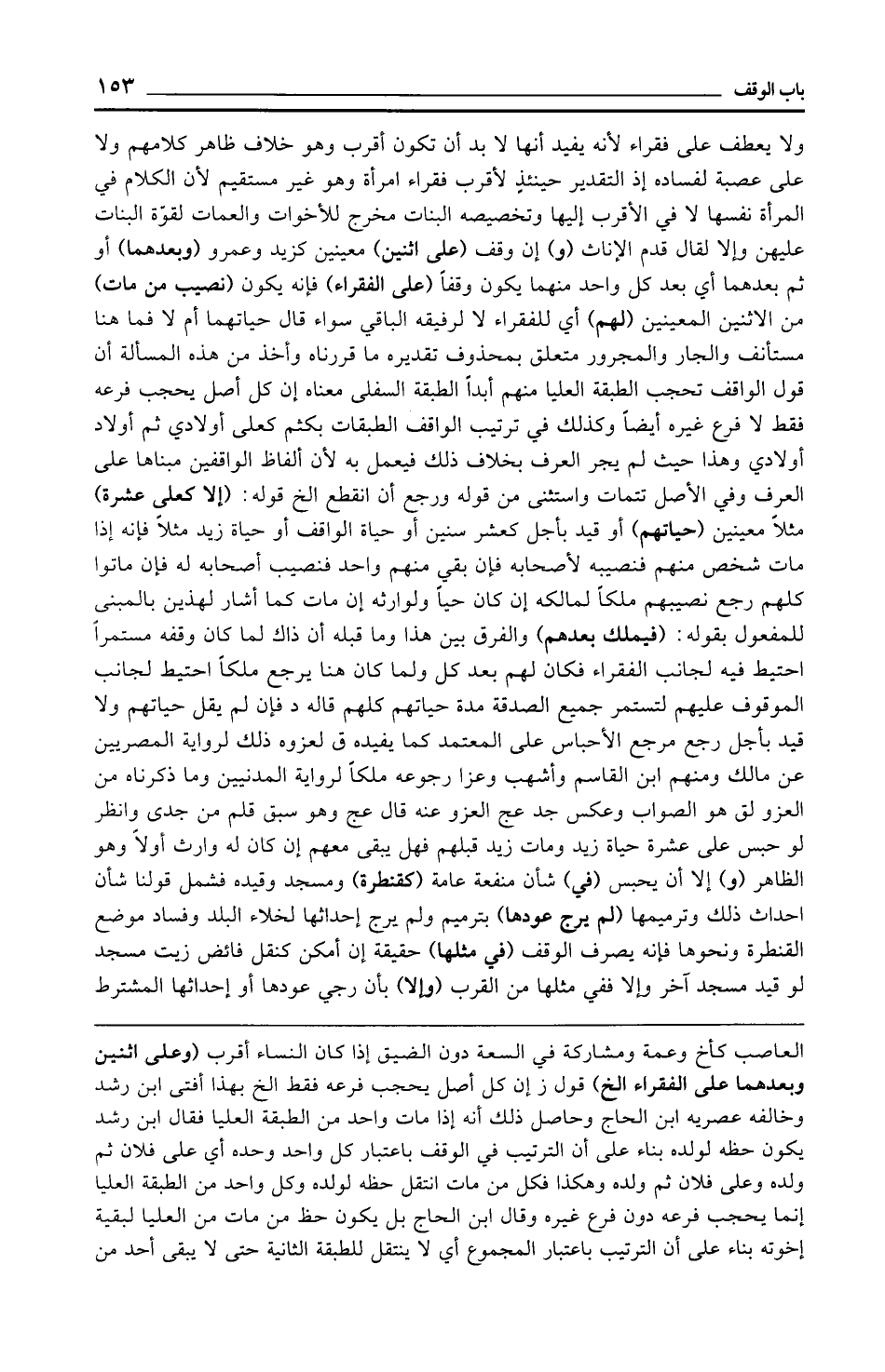 العاصب كأخ وعمة ومشاركة في السعة دون الضيق إذا كان النساء أقرب (وعلى اثنين وبعدهما على الفقراء الخ) قول ز إن كل أصل يحجب فرعه فقط الخ بهذا أفتى ابن رشد وخالفه عصريه ابن الحاج وحاصل ذلك أنه إذا مات واحد من الطبقة العليا فقال ابن رشد يكون حظه لولده بناء على أن الترتيب في الوقف باعتبار كل واحد وحده أي على فلان ثم ولده وعلى فلان ثم ولده وهكذا فكل من مات انتقل حظه لولده وكل واحد من الطبقة العليا إنما يحجب فرعه دون فرع غيره وقال ابن الحاج بل يكون حظ من مات من العليا لبقية إخوته بناء على أن الترتيب باعتبار المجموع أي لا ينتقل للطبقة الثانية حتى لا يبقى أحد من