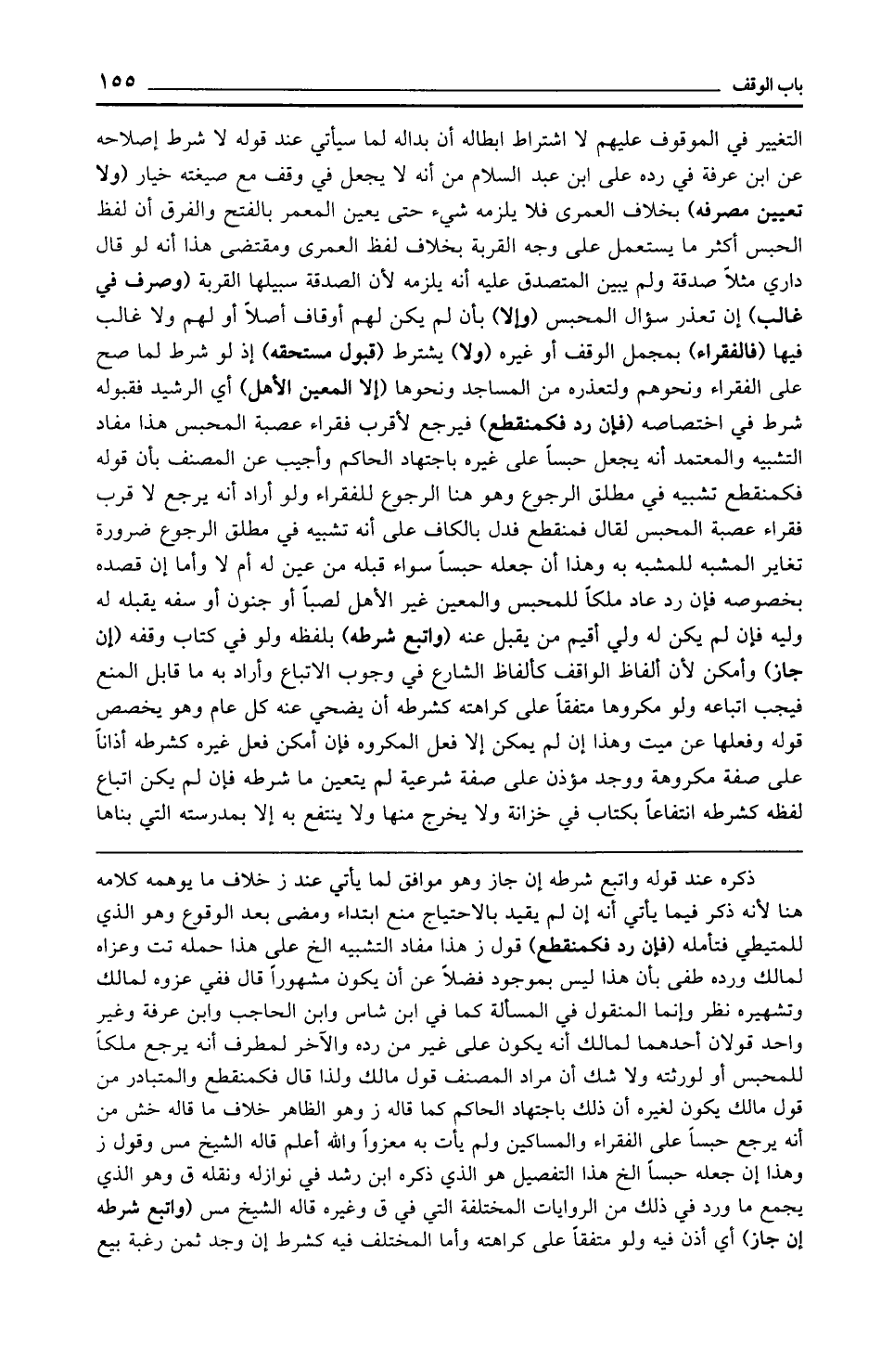 ذكره عند قوله واتبع شرطه إن جاز وهو موافق لما يأتي عند ز خلاف ما يوهمه كلامه هنا لأنه ذكر فيما يأتي أنه إن لم يقيد بالاحتياج منع ابتداء ومضى بعد الوقوع وهو الذي للمتيطي فتأمله (فإن رد فكمنقطع) قول ز هذا مفاد التشبيه الخ على هذا حمله تت وعزاه لمالك ورده طفى بأن هذا ليس بموجود فضلًا عن أن يكون مشهورًا قال ففي عزوه لمالك وتشهيره نظر وإنما المنقول في المسألة كما في ابن شاس وابن الحاجب وابن عرفة وغير واحد قولان أحدهما لمالك أنه يكون على غير من رده والآخر لمطرف أنه يرجع ملكًا للمحبس أو لورثته ولا شك أن مراد المصنف قول مالك ولذا قال فكمنقطع والمتبادر من قول مالك يكون لغيره أن ذلك باجتهاد الحاكم كما قاله ز وهو الظاهر خلاف ما قاله خش من أنه يرجع حبسًا على الفقراء والمساكين ولم يأت به معزوًا والله أعلم قاله الشيخ مس وقول ز وهذا إن جعله حبسًا الخ هذا التفصيل هو الذي ذكره ابن رشد في نوازله ونقله ق وهو الذي يجمع ما ورد في ذلك من الروايات المختلفة التي في ق وغيره قاله الشيخ مس (واتبع شرطه إن جاز) أي أذن فيه ولو متفقًا على كراهته وأما المختلف فيه كشرط إن وجد ثمن رغبة بيع