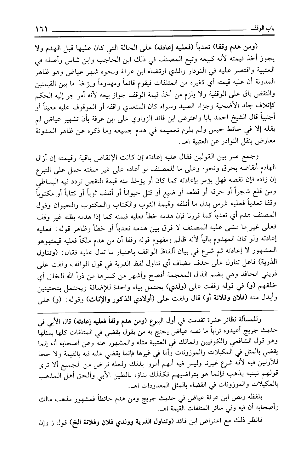 وللمسألة نظائر عشرة تقدمت في أول البيوع (ومن هدم وقفًا فعليه إعادته) قال الأبي في حديث جريج أعيدوه ترابًا ما نصه عياض يحتج به من يقول يقضي في المتلفات كلها بمثلها وهو قول الشافعي والكوفيين ولمالك في العتبية مثله والمشهور عنه وعن أصحابه أنه إنما يقضي بالمثل في المكيلات والموزونات وأما في غيرها فإنما يقضي عليه فيه بالقيمة ولا حجة للأولين فيه لأنه شرع غيرنا وليس فيه أنهم أمروا بذلك ولعله تراض من الجميع ألا ترى قولهم نبنيه بذهب فإنما هو بتراضيهم فكذلك بناؤه بالطين الأبي وألحق أهل المذهب بالمكيلات والموزونات في القضاء بالمثل المعدودات اهـ.