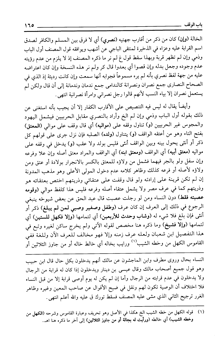 وأيضًا يقال له ليس فيه التنصيص على الأقارب الكفار إلا أن يجيب بأنه استغنى عن ذلك بقوله أول الباب وذمي وإن لم الخ وأراد بالنصري مقابل الحربيين فيشمل اليهود والمجوس غير الحربيين (و) تناول وقفه على (مواليه) أي قال وقف على موالي (المعتق) بفتح التاء وهو من أعتقه الواقف (و) يتناول (ولده) الصلبه فإن نزل جرى على قولهم كل ذكر أو أنثى يحول بينه وبين الواقف أنثى فليس بولد ولا عقب (و) يدخل في وقفه على مواليه (معتق أبيه) أي الواقف (ومعتق ابنه) أي الواقف والمراد معتق أصله وإن علا وفرعه وإن سفل ولو بالجر فيهما فشمل من ولاؤه للمعتق بالكسر بالانجرار بولادة أو عتق ومن ولاؤه لأصله أو فرعه كذلك وظاهر كلامه عدم دخول المولى الأعلى وهو مذهب المدونة إن لم تكن قرينة على إرادته ولو قال وقفت على عتقائي وذريتهم اختص بعتقائه هو وذريتهم كما في عرف مصر ولا يشمل عتقاء أصله وفرعه فليس هذا كلفظ موالي (وقومه عصبته فقط) دون النساء ومن لو رجلت عصبت قال عبد الحق عن بعض شيوخه ينبغي الرجوع في ذلك إلى العرف إن كان عرف (وطفل وصغير وصبي لمن لم يبلغ) ذكر أو أنثى فإن بلغ فلا شيء له (وشاب وحدث للأربعين) أي لتمامها (وإلا فكهل للستين) أي لتمامها (وإلا فشيخ) وما ذكره هنا مخصص لقوله الآتي ولم يخرج ساكن لغيره وتبع في هذا التفصيل ابن شعبان ولعله عرف زمنه وإلا فهو مخالف للعرف الآن وللغة ففي القاموس الكهل من وخطه الشيب (¬1) ورايب بخاله أي خالط خاله أو من جاوز الثلاثين أو