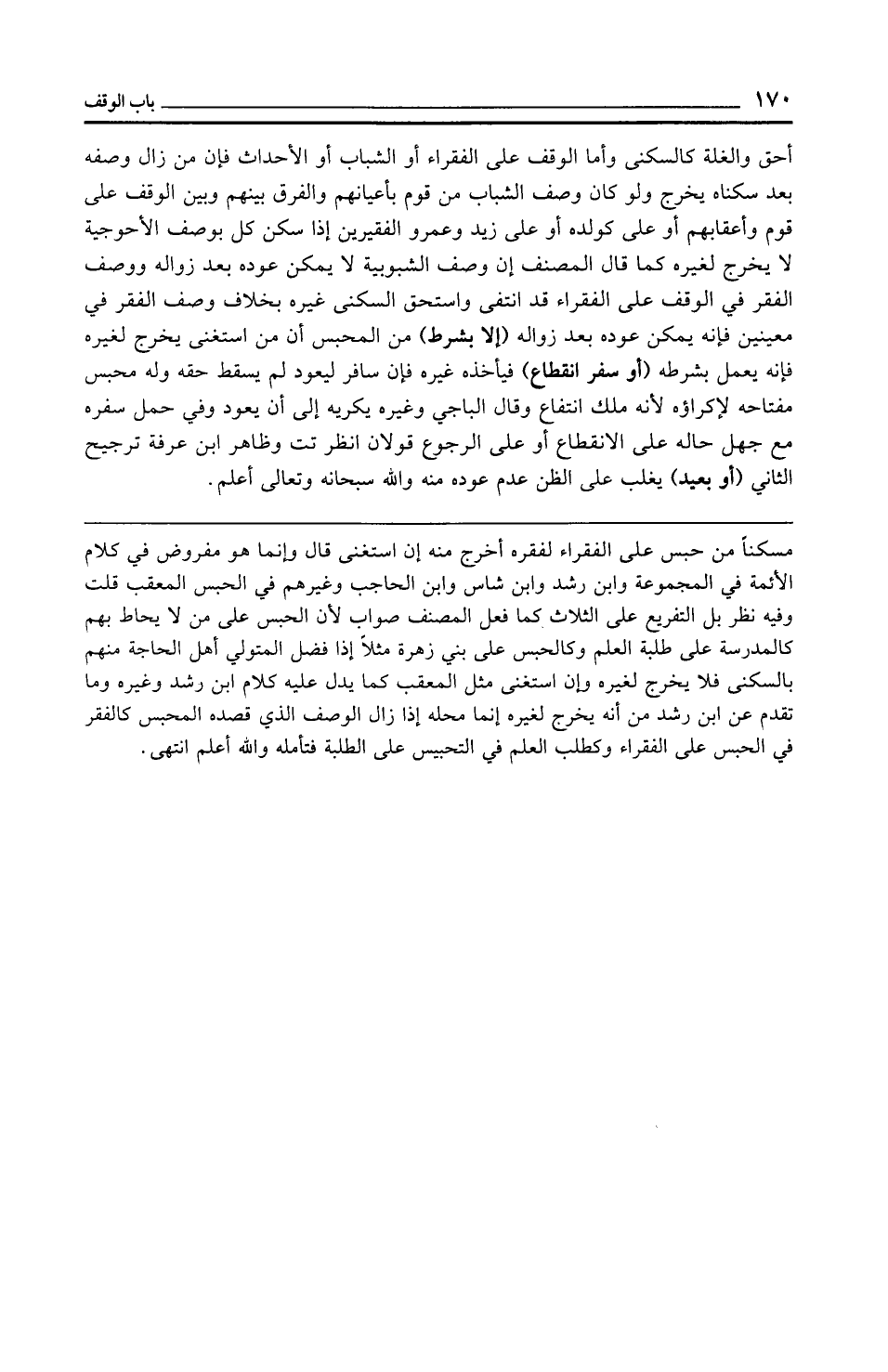 أحق والغلة كالسكنى وأما الوقف على الفقراء أو الشباب أو الأحداث فإن من زال وصفه بعد سكناه يخرج ولو كان وصف الشباب من قوم بأعيانهم والفرق بينهم وبين الوقف على قوم وأعقابهم أو على كولده أو على زيد وعمرو الفقيرين إذا سكن كل بوصف الأحوجية لا يخرج لغيره كما قال المصنف إن وصف الشبوبية لا يمكن عوده بعد زواله ووصف الفقر في الوقف على الفقراء قد انتفى واستحق السكنى غيره بخلاف وصف الفقر في معينين فإنه يمكن عوده بعد زواله (إلا بشرط) من المحبس أن من استغنى يخرج لغيره فإنه يعمل بشرطه (أو سفر انقطاع) فيأخذه غيره فإن سافر ليعود لم يسقط حقه وله محبس مفتاحه لإكراؤه لأنه ملك انتفاع وقال الباجي وغيره يكريه إلى أن يعود وفي حمل سفره مع جهل حاله على الانقطاع أو على الرجوع قولان انظر تت وظاهر ابن عرفة ترجيح الثاني (أو بعيد) يغلب على الظن عدم عوده منه والله سبحانه وتعالى أعلم.